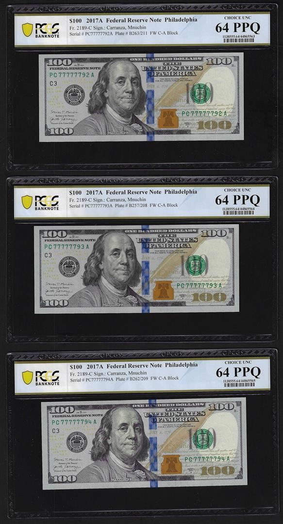 (3) Consec. 2017A $100 Federal Reserve Bank Notes PCGS Choice Unc. 64PPQ Fancy Serial