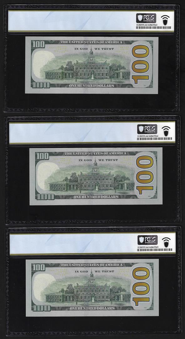 One (3) Consec. 2017A $100 Federal Reserve Bank Notes PCGS Choice Unc. 64PPQ Fancy Serial. PCGS Graded.