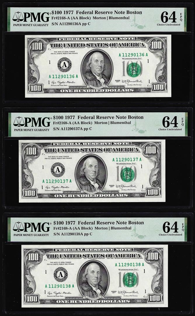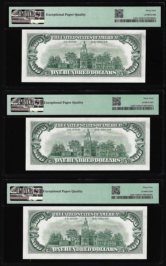 One (3) Consecutive $100 Federal Reserve Notes Fr.2168-A PMG Choice Uncirculated 64EPQ. PMG Certified.
