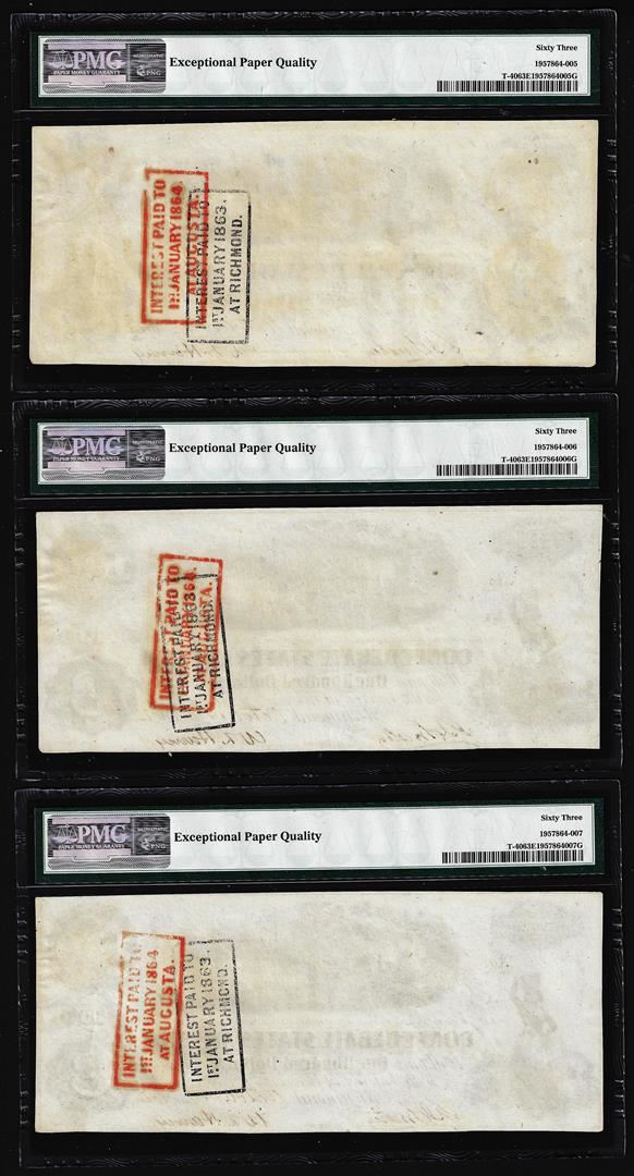 One (3) Consecutive 1862 $100 Confederate States of America Notes PMG Ch. Uncirculated 63EPQ. PMG Certified.