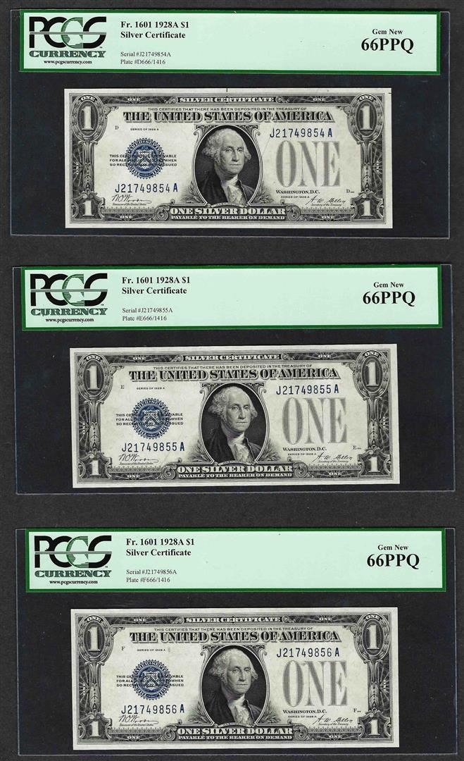 (3) Consecutive 1928A $1 Funnyback Silver Certificate Notes Fr.1601 PCGS Gem New 66PPQ