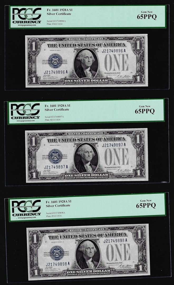 (3) Consecutive 1928A $1 Funnyback Silver Certificate Notes PCGS Gem New 65PPQ