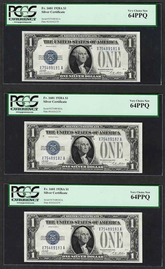 One Lot of (3) Consecutive 1928A $1 Funnyback Silver Certificate Notes PCGS Very Choice New 64PPQ. PCGS Graded.