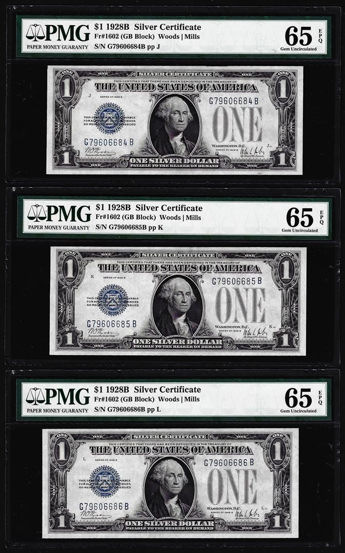One (3) Consecutive 1928B $1 Silver Certificate Notes Fr.1602 PMG Gem Uncirculated 65EPQ. PMG Certified.
