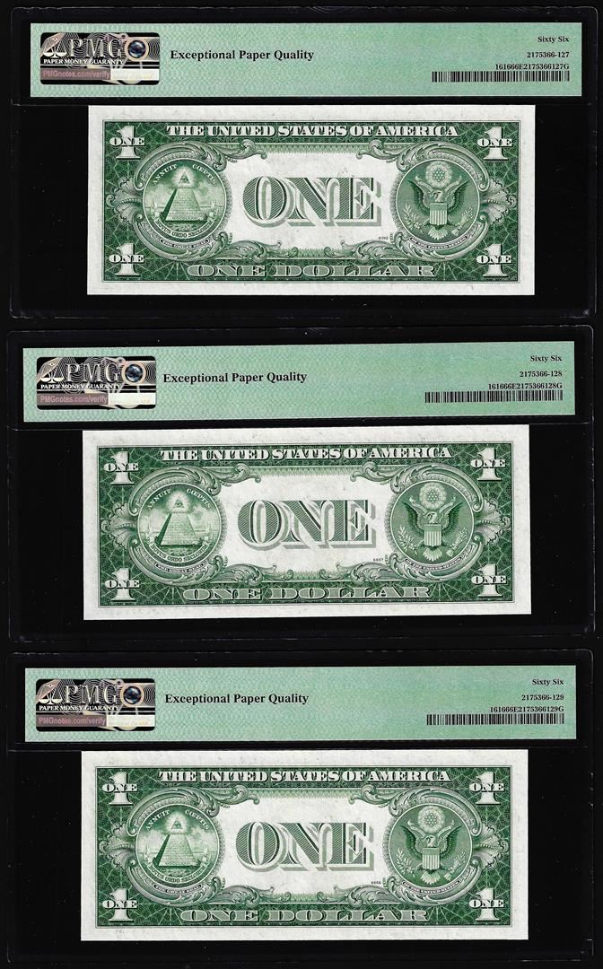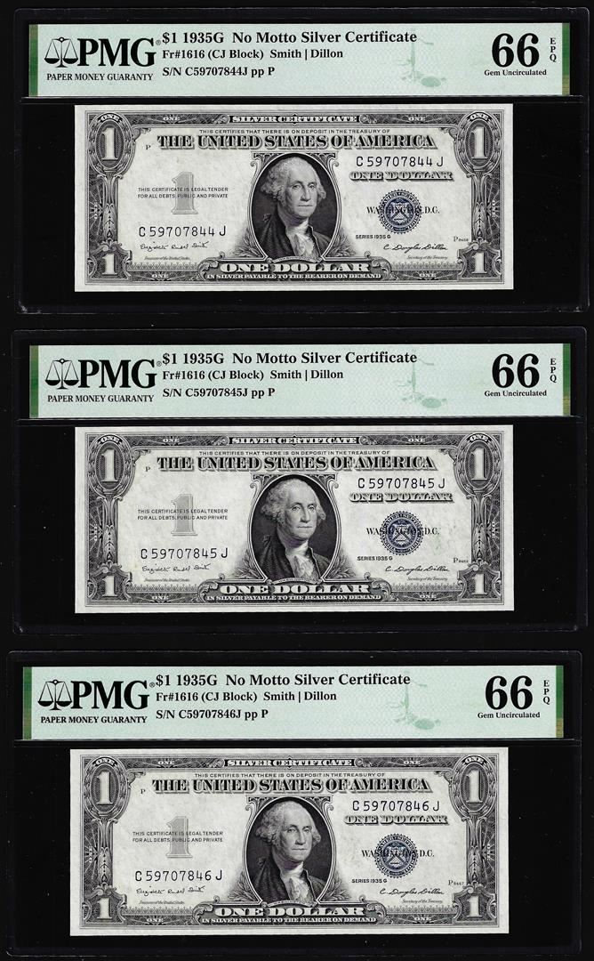 One (3) Consecutive 1935G No Motto $1 Silver Certificate Notes PMG Gem Uncirculated 66EPQ. PMG Certified.