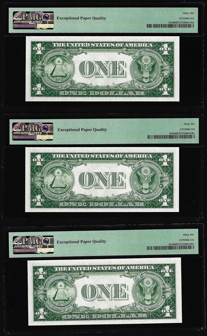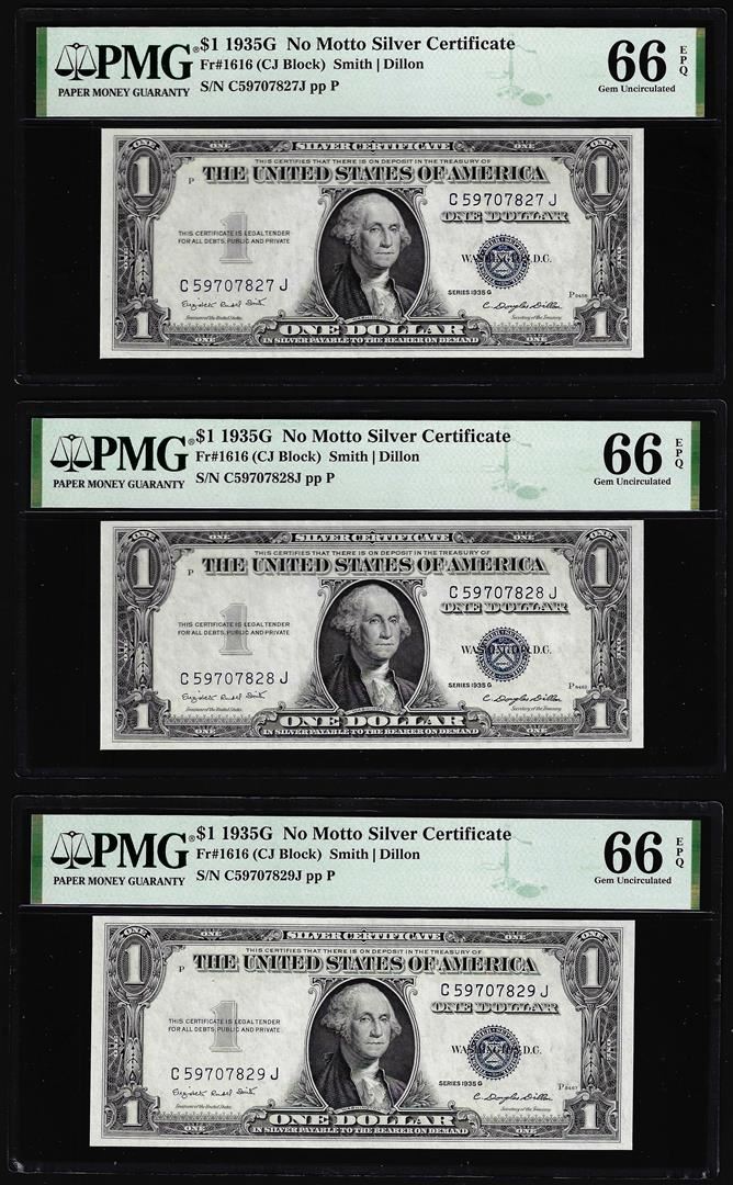 One (3) Consecutive 1935G No Motto $1 Silver Certificate Notes PMG Gem Uncirculated 66EPQ. PMG Certified.