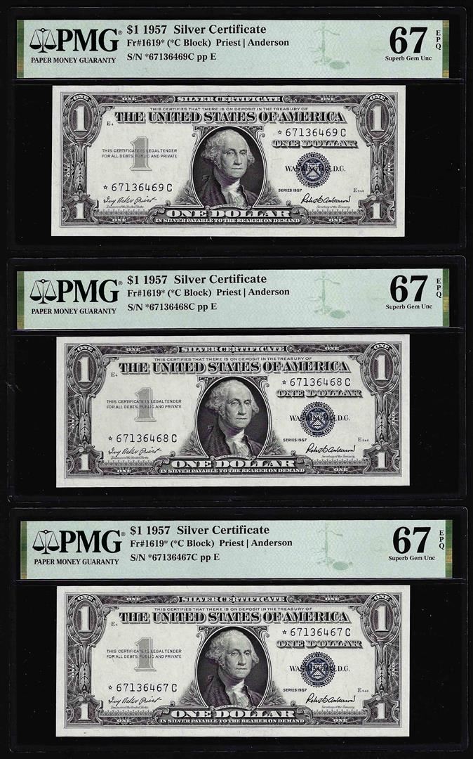 (3) Consecutive 1957 $1 Silver Certificate Star Notes Fr.1619* PMG Superb Gem Unc. 67EPQ
