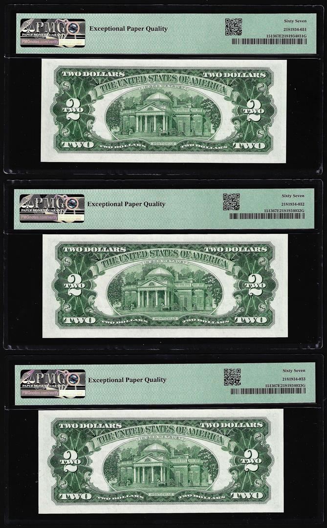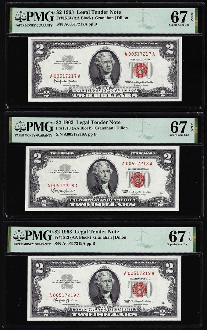 One (3) Consecutive 1963 $2 Legal Tender Notes Fr.1513 PMG Superb Gem Uncirculated 67EPQ. PMG Certified.