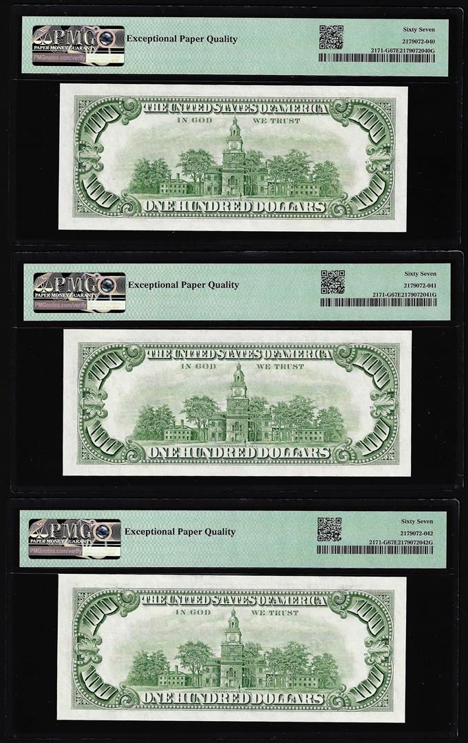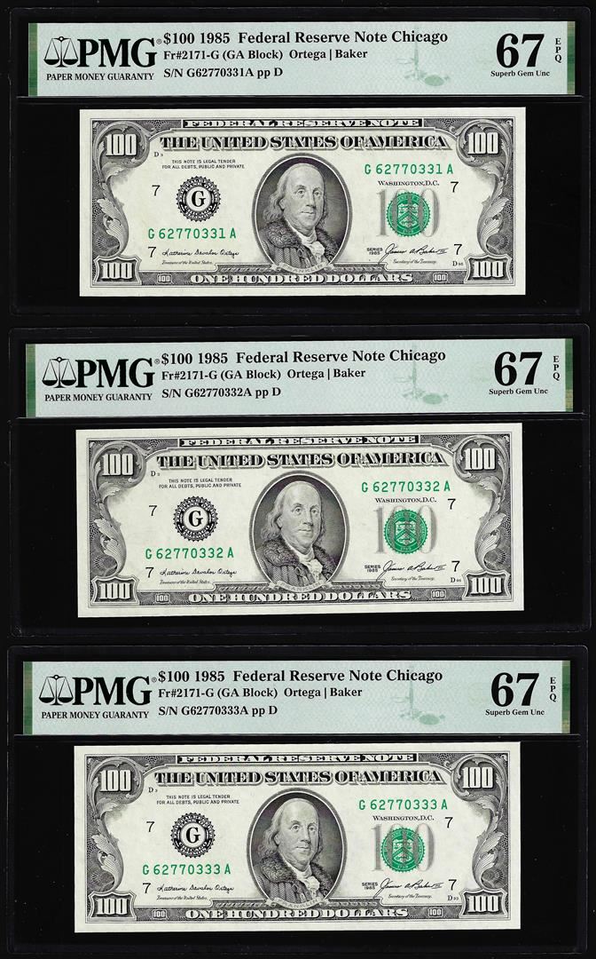 One (3) Consecutive 1985 $100 Federal Reserve Notes Fr.2171-G PMG Superb Gem Unc 67EPQ. PMG Certified.