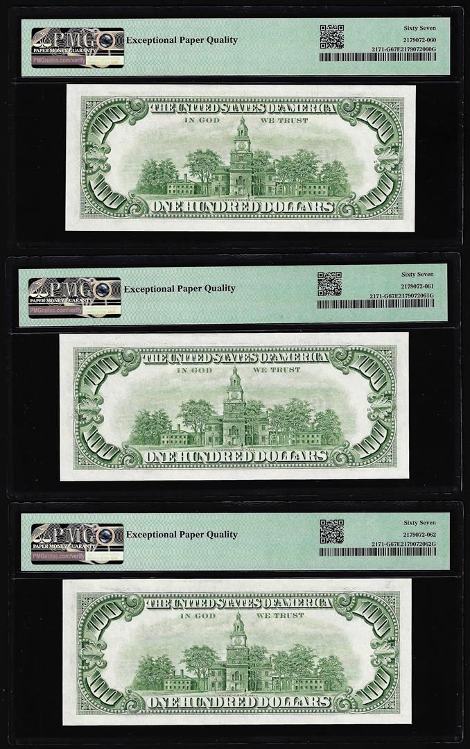 One (3) Consecutive 1985 $100 Federal Reserve Notes Fr.2171-G PMG Superb Gem Unc 67EPQ. PMG Certified.