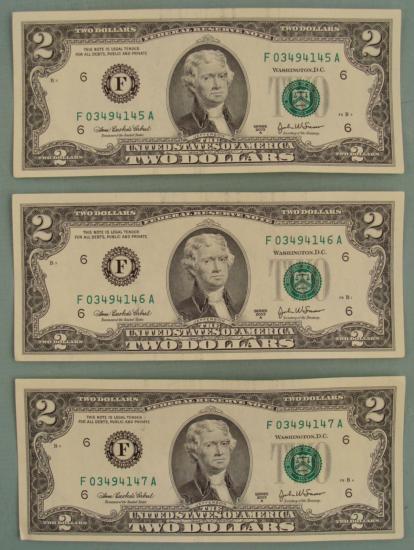 (3) 2003-A $2 bills, with consecutive serial numbers * * Mint mark: F (Atlanta) * Grade: Crisp Uncirculated * * Exact serial number might be different from the one shown