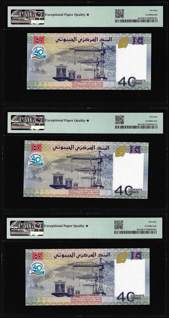 One (3) Consecutive 2017 Djibouti 40 Francs Bank Notes PMG Seventy Gem Uncirculated 70EPQ*. PMG Certified.