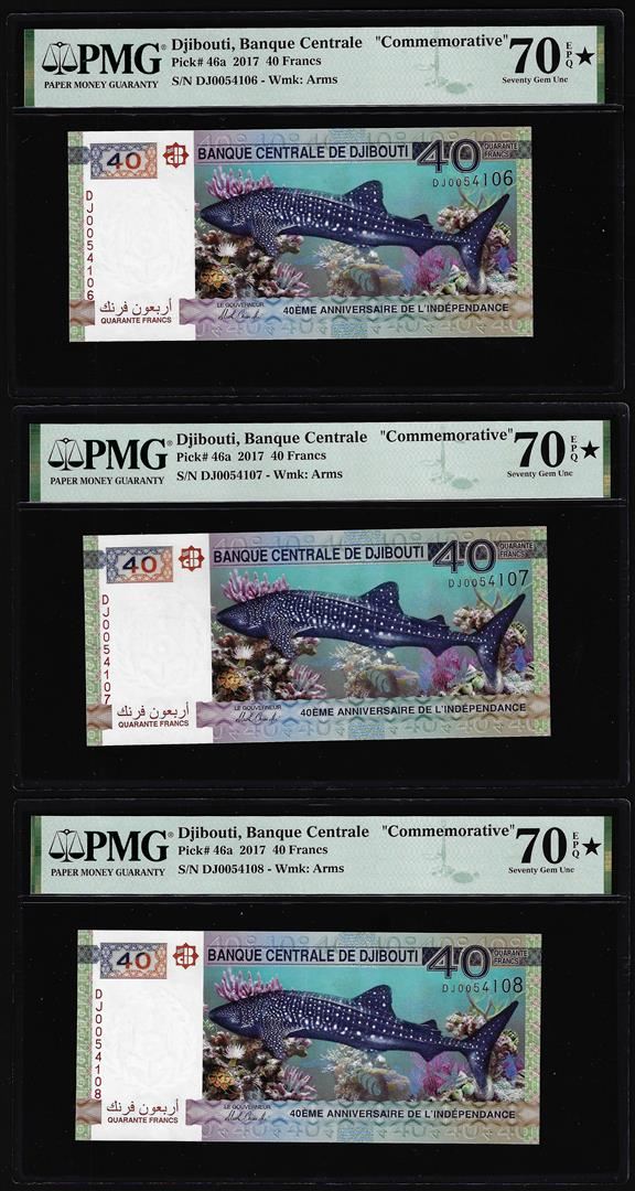 One (3) Consecutive 2017 Djibouti 40 Francs Bank Notes PMG Seventy Gem Uncirculated 70EPQ*. PMG Certified.