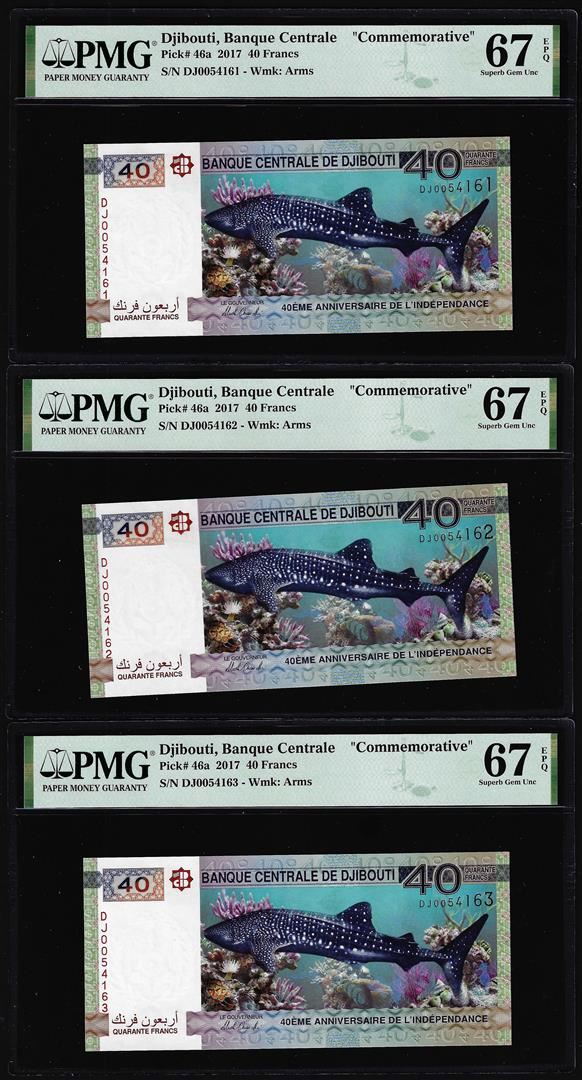 One (3) Consecutive 2017 Djibouti 40 Francs Bank Notes PMG Superb Gem Uncirculated 67EPQ. PMG Certified.