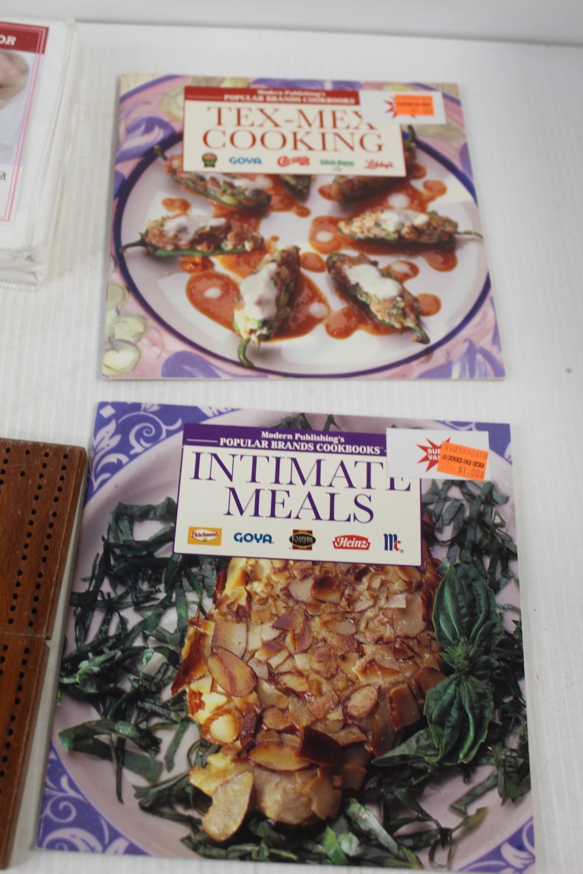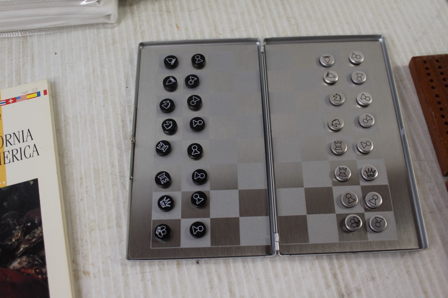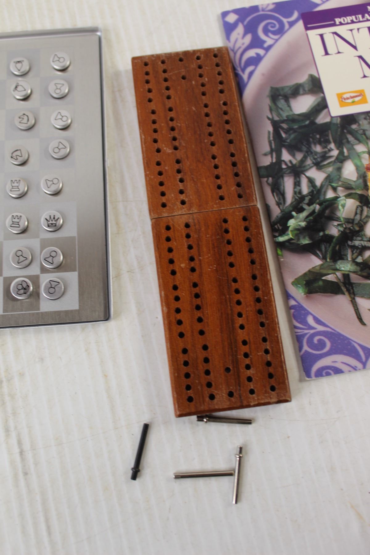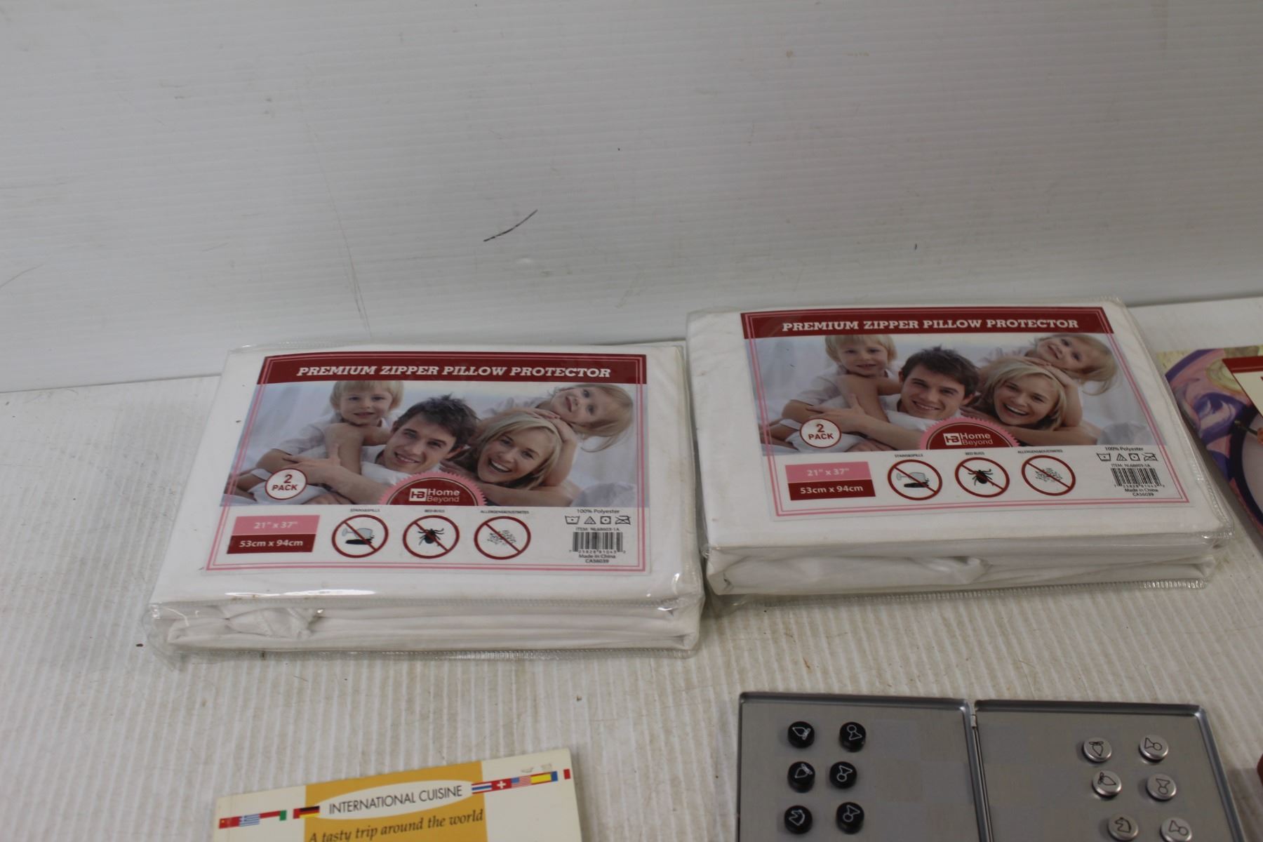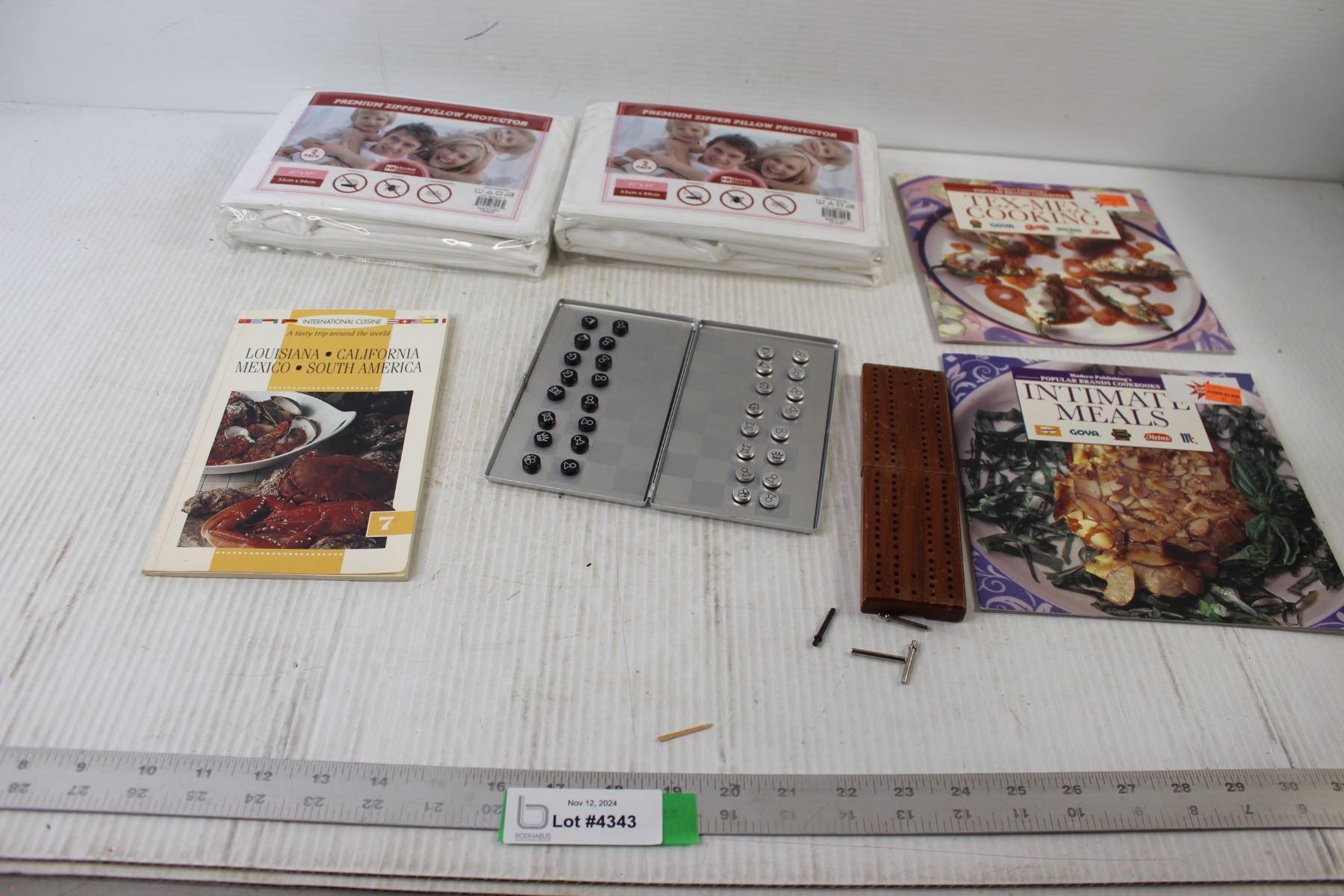 (3) Cookbooks, Small Cribbage and Chess Sets, (2) Premium Zipper Pillow Protectors