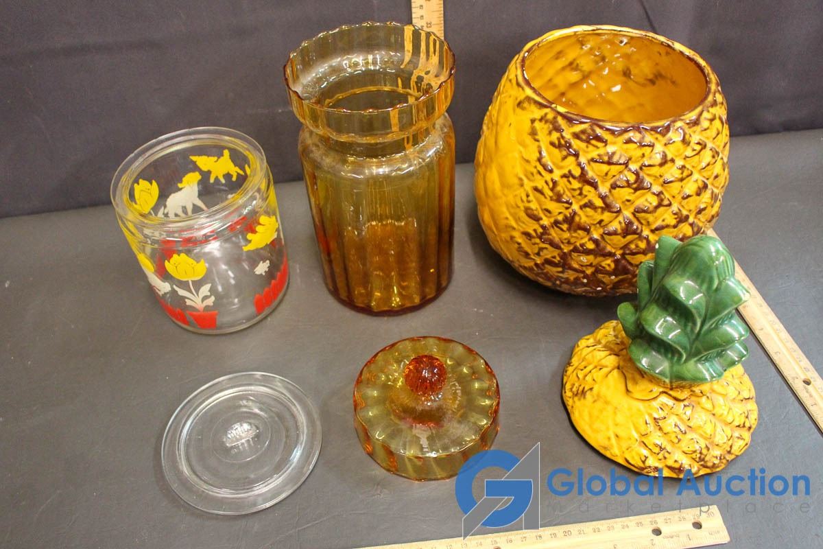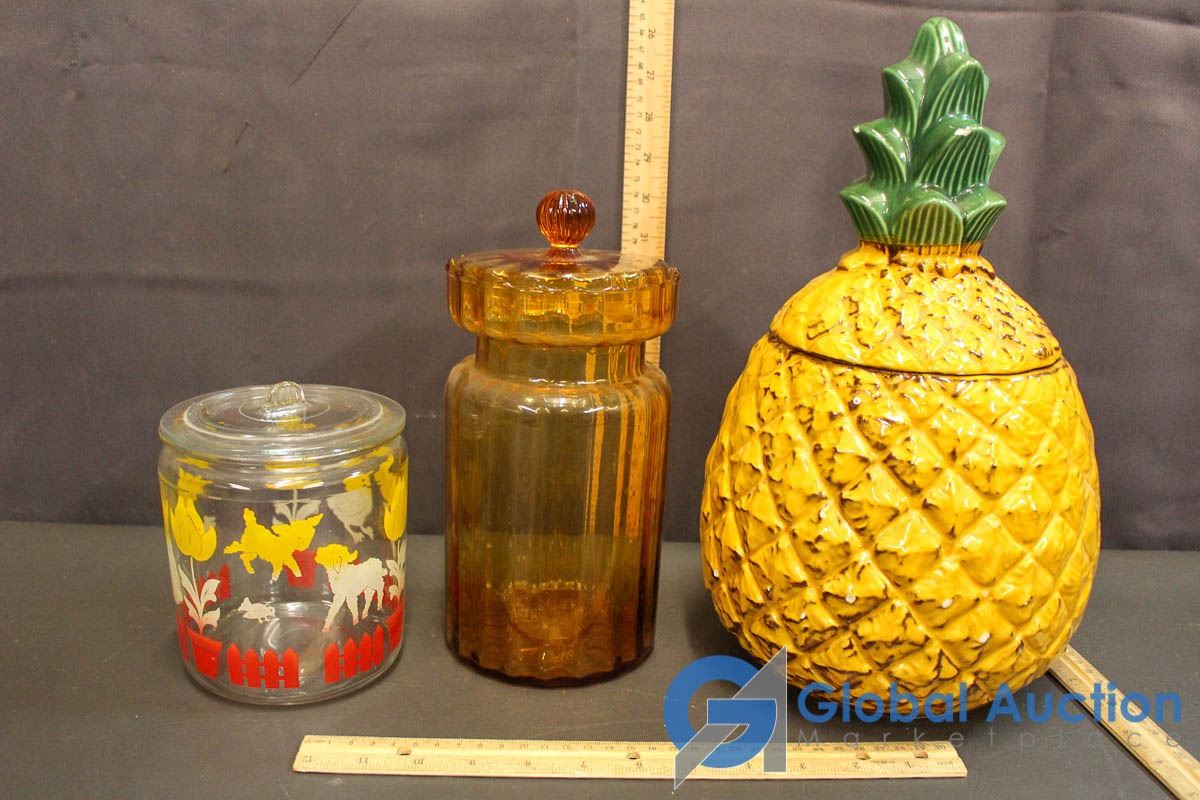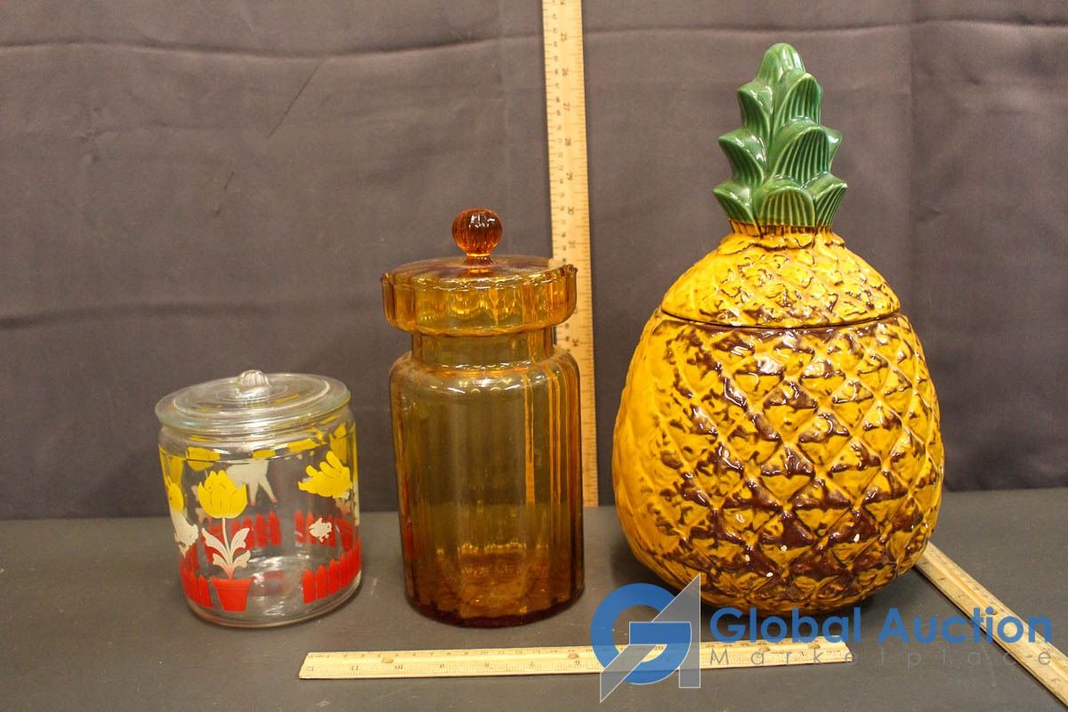 (3) Cookie Jars - Ceramic Pine Apple, Glass