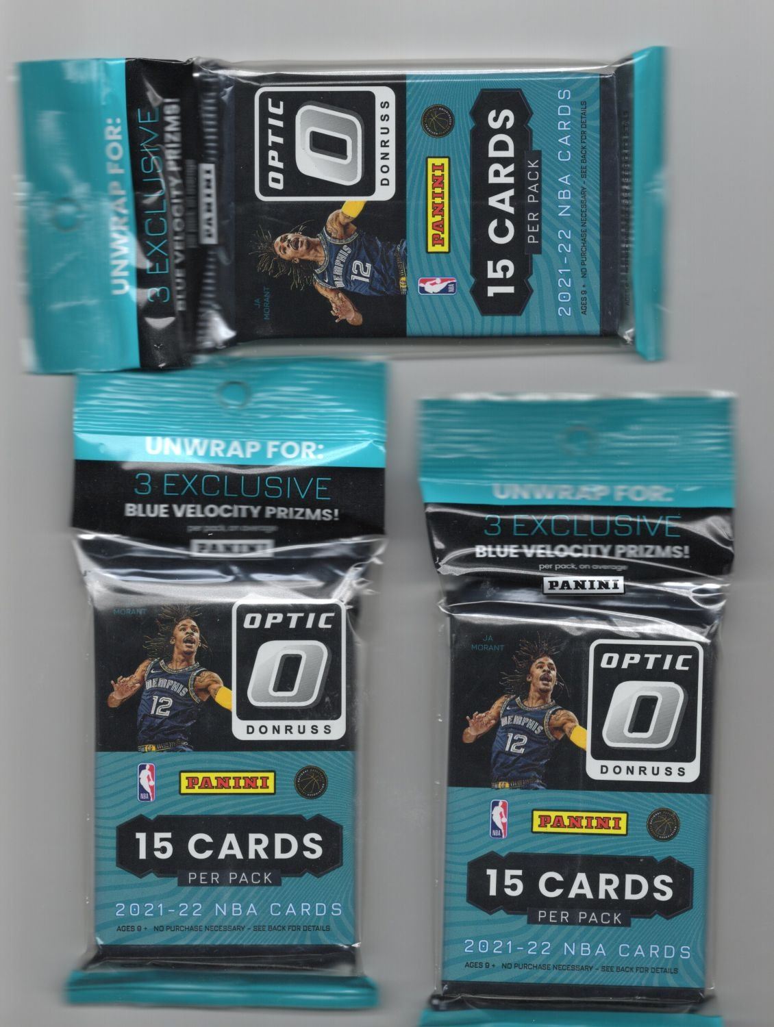 3 Count of 2021-2022 Donruss Optic Basketball Cello Value Packs. 3 Packs of 15 Cards per Pack. 3 Blue Velocity Prizms per Pack!!