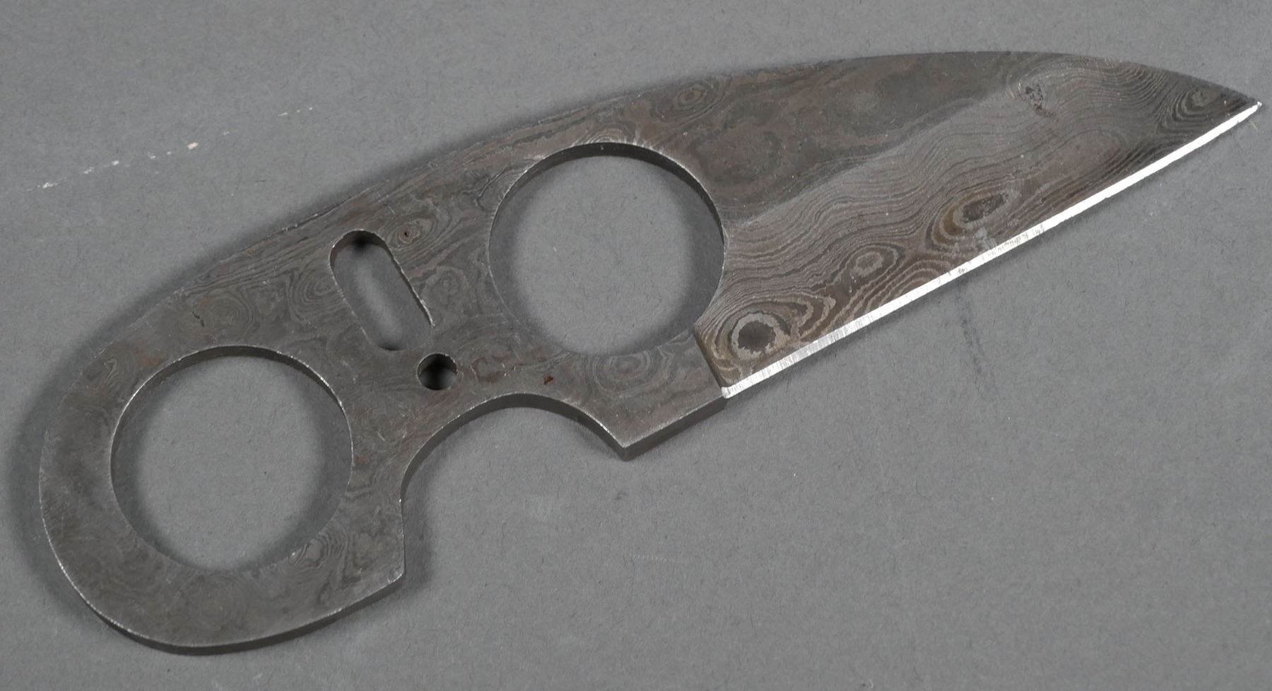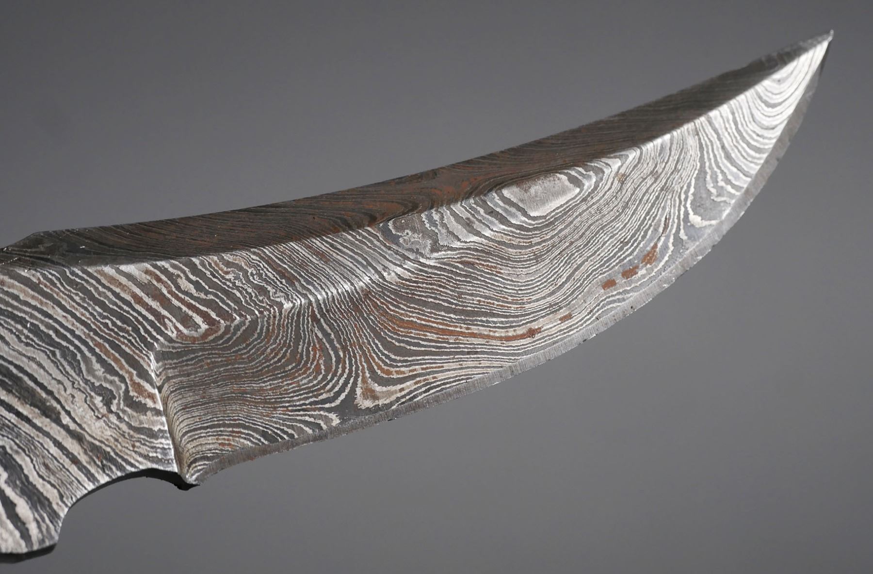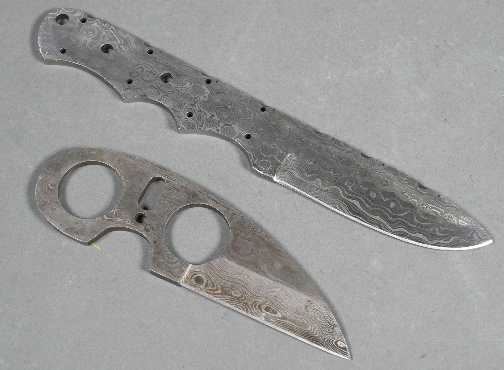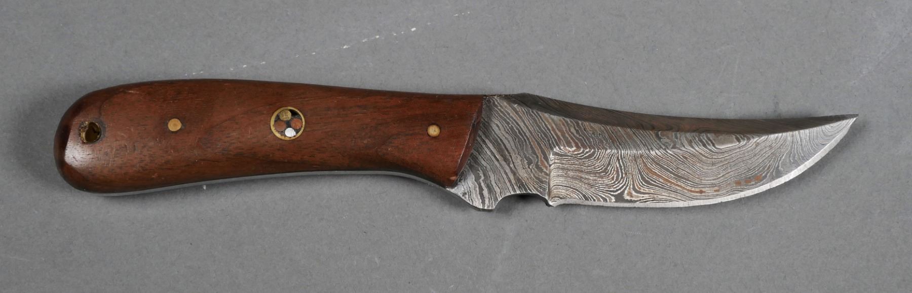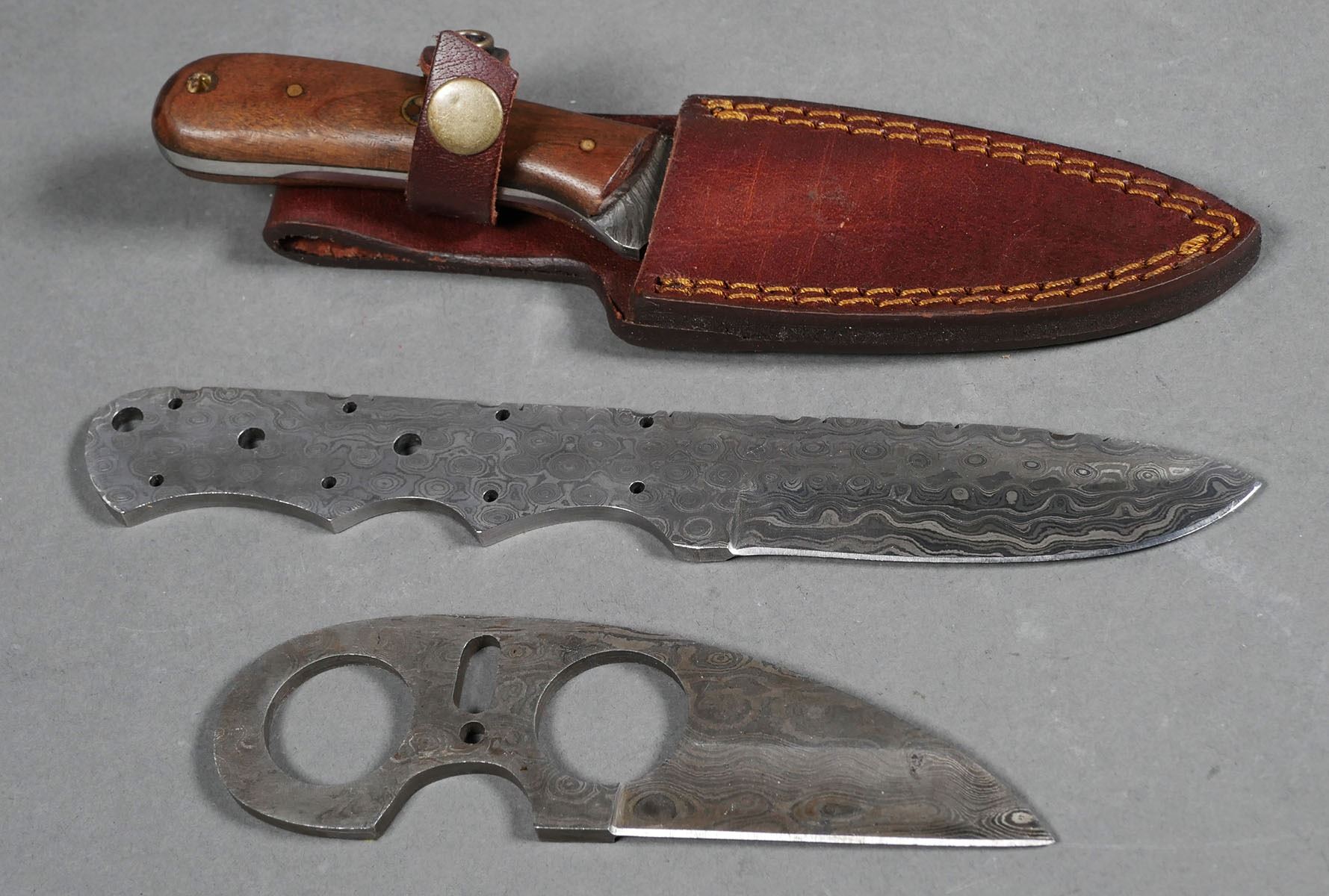 Three handmade custom fixed blade knives from knifemaker in Indiana. 1) 3 3/4" Damascus steel trailing point blade, 7 5/8" overall, light wear to wood handle, blade does not appear to have been re-sharpened. Notched full tang with lanyard hole. Leather sheath included. 2) Damascus steel clip point knife blank, 4" blade, 8 7/8" overall. Notched full tang with lanyard hole. 3) Damascus steel wharncliffe knife blank, 3" blade, 6" overall. Tip is slightly blunted. See photos for more details on condition.