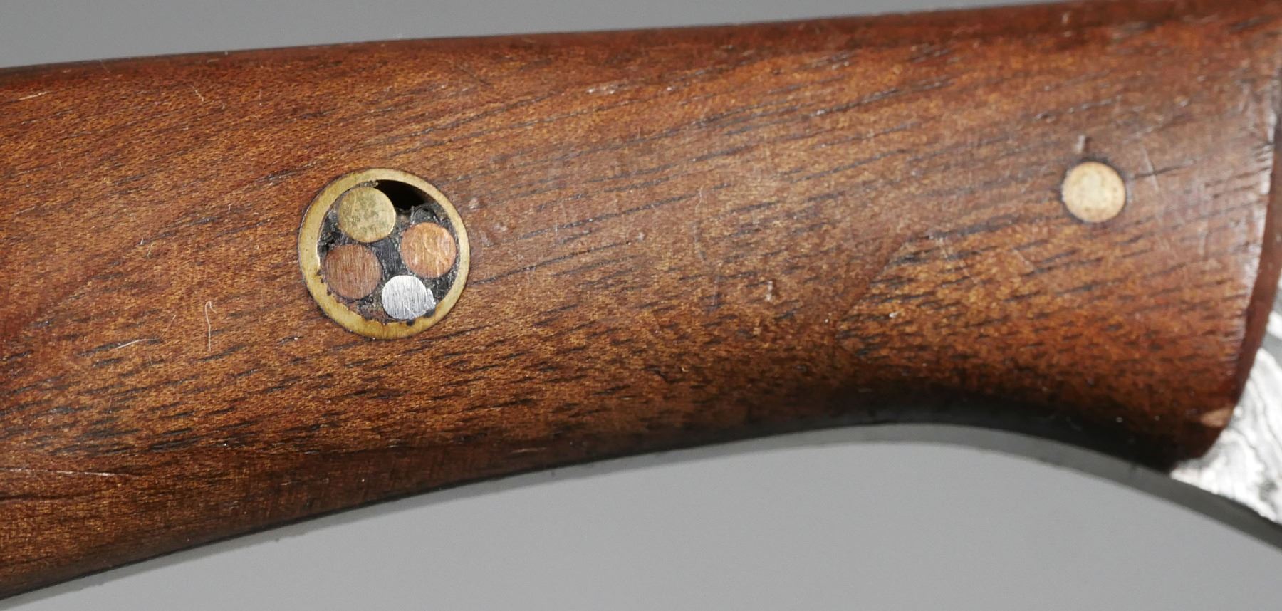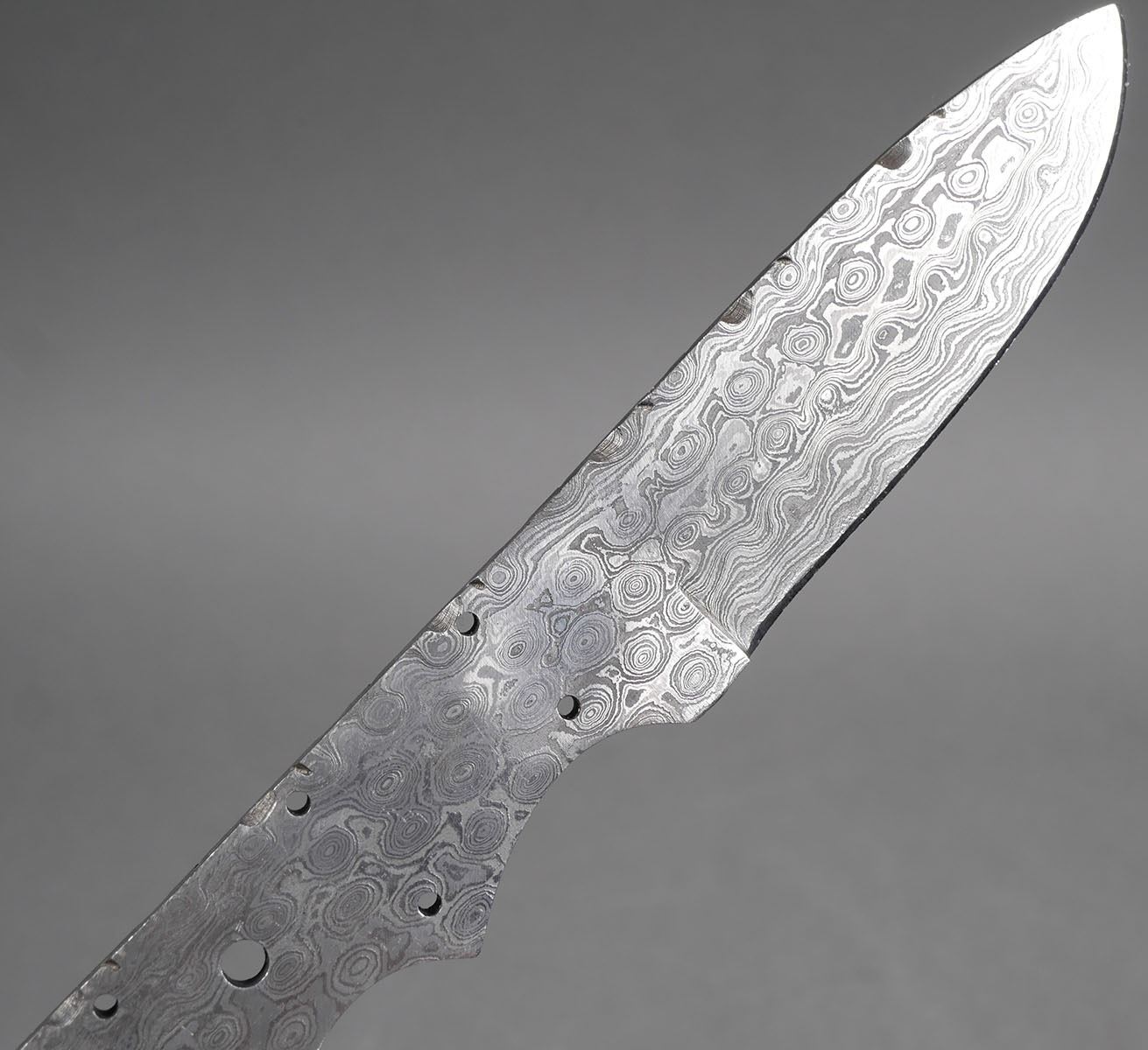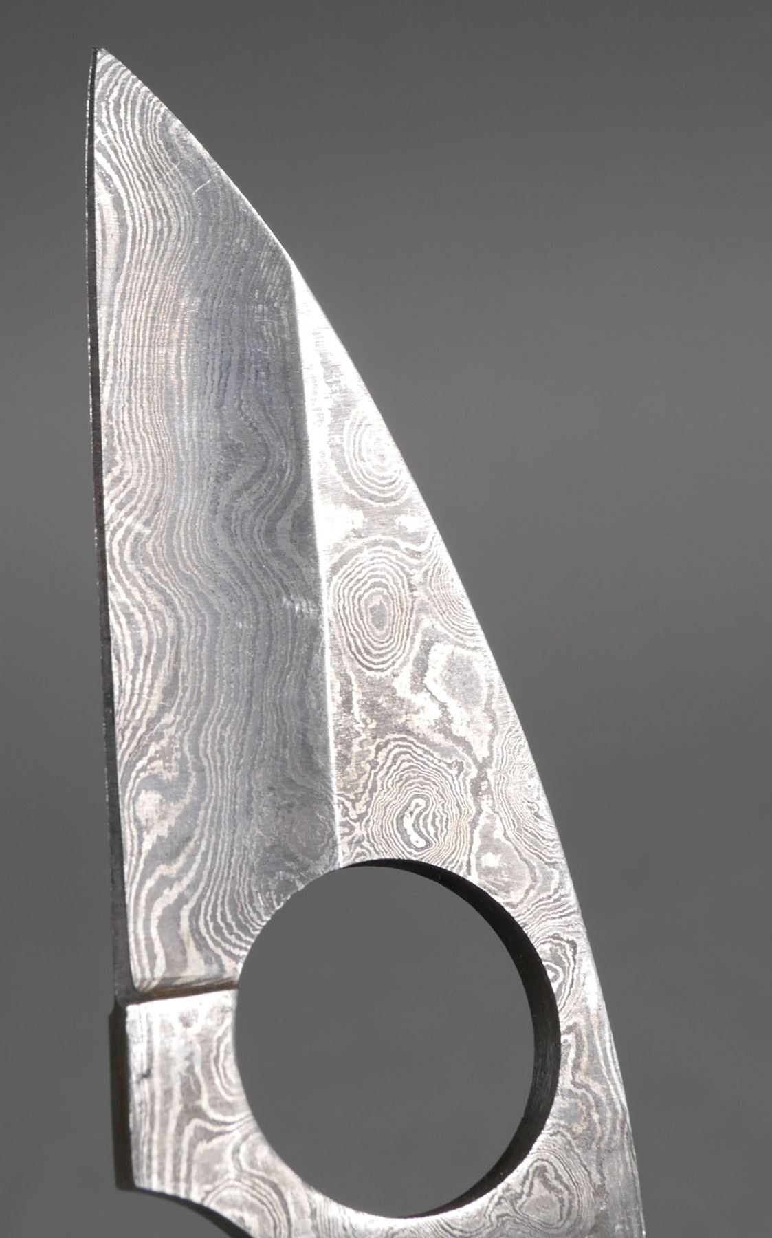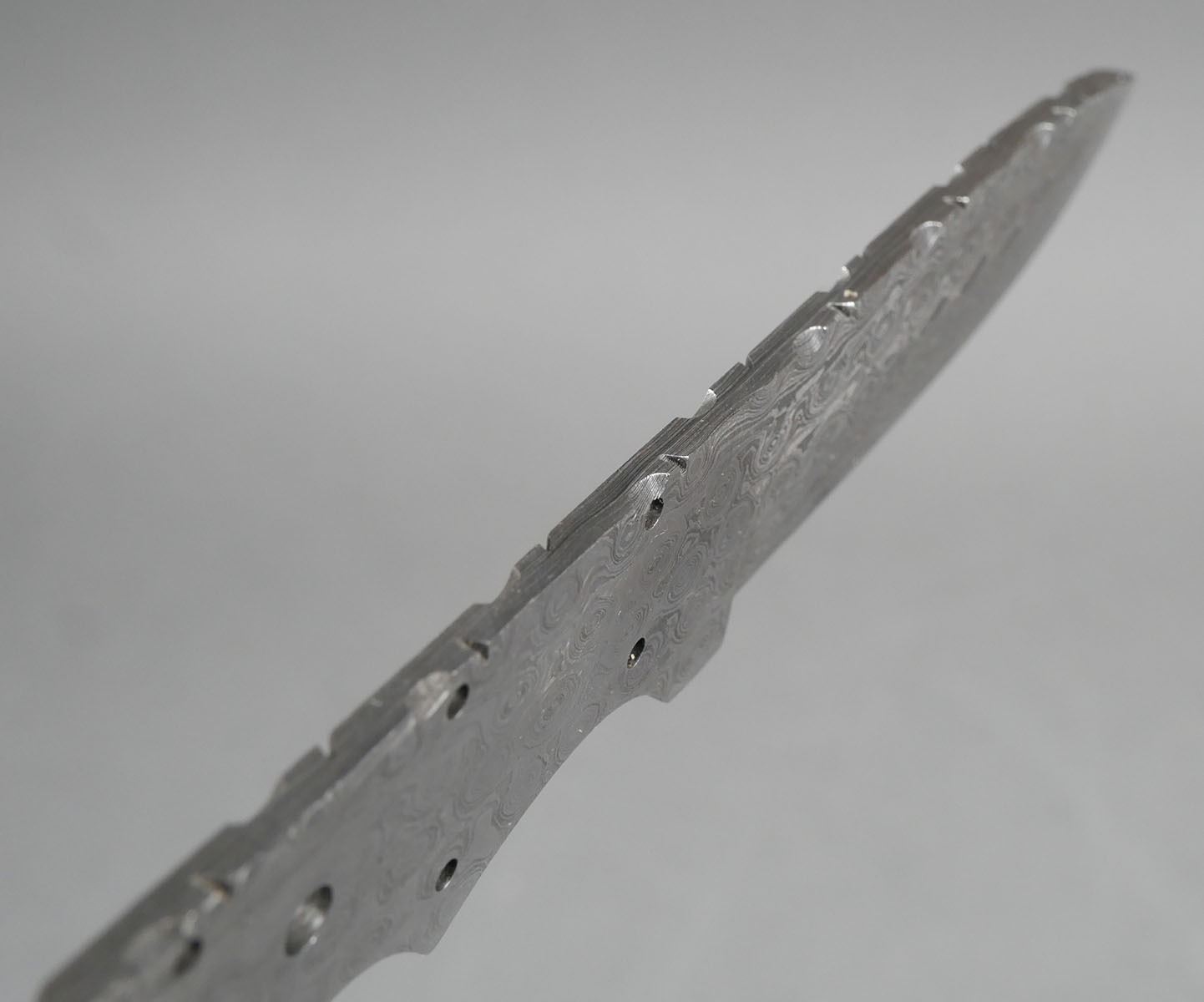 Three handmade custom fixed blade knives from knifemaker in Indiana. 1) 3 3/4" Damascus steel trailing point blade, 7 5/8" overall, light wear to wood handle, blade does not appear to have been re-sharpened. Notched full tang with lanyard hole. Leather sheath included. 2) Damascus steel clip point knife blank, 4" blade, 8 7/8" overall. Notched full tang with lanyard hole. 3) Damascus steel wharncliffe knife blank, 3" blade, 6" overall. Tip is slightly blunted. See photos for more details on condition.