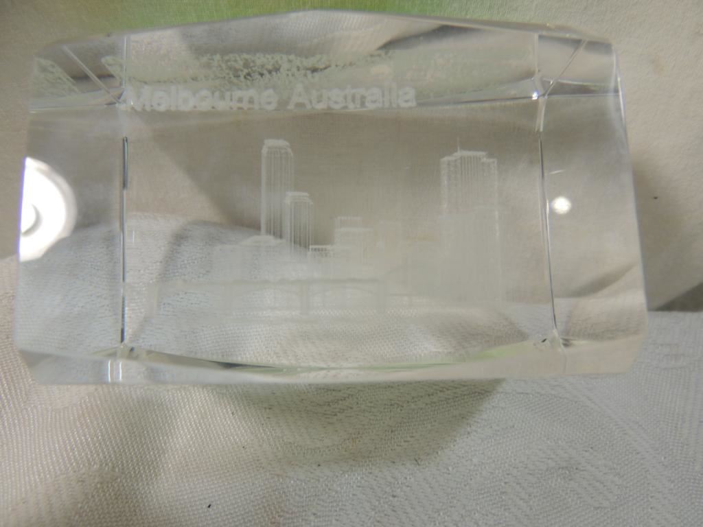 MELBOURNE AUSTRALIA PAPERWEIGHT SOUVNEIR PAPERWEIGHT, COLLECTORS PAPERWEIGHT, LAZER ETCHED 3-D AS SHOWN SEE PHOTO FOR MORE DETAILS.