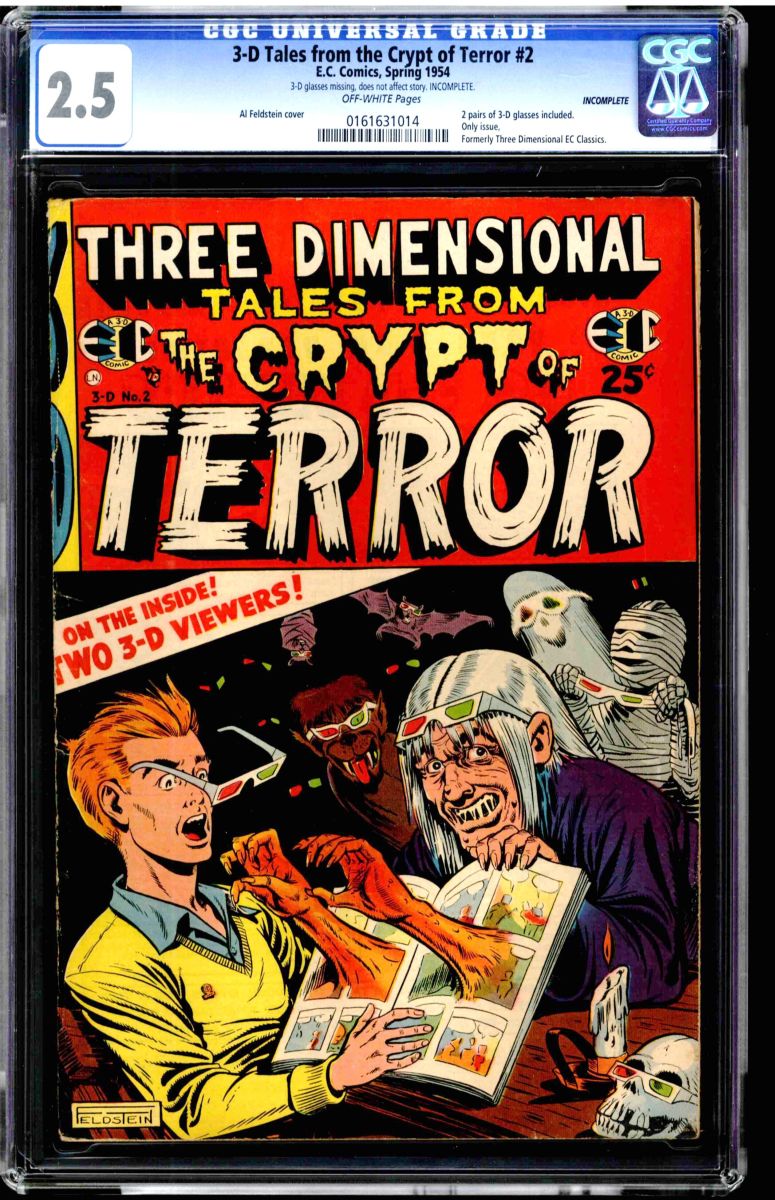 3-D Tales From The Crypt Of Terror #2 CGC 2.5 off-white pages. Marked incomplete due to missing glasses - this is not entirely accurate, as one pair of the original glasses (minus the ear-rests) are included with this lot. Al Feldstein cover. Originally came packaged with 2 pairs of 3-D glasses. Only issue, formerly Three Dimensional EC Classics.