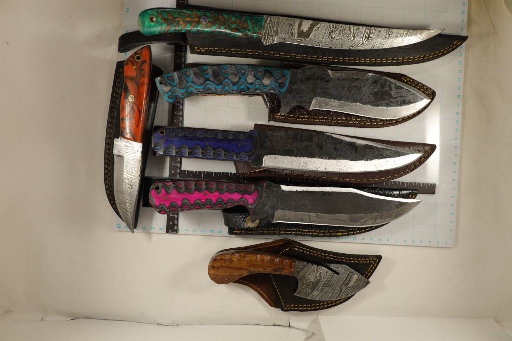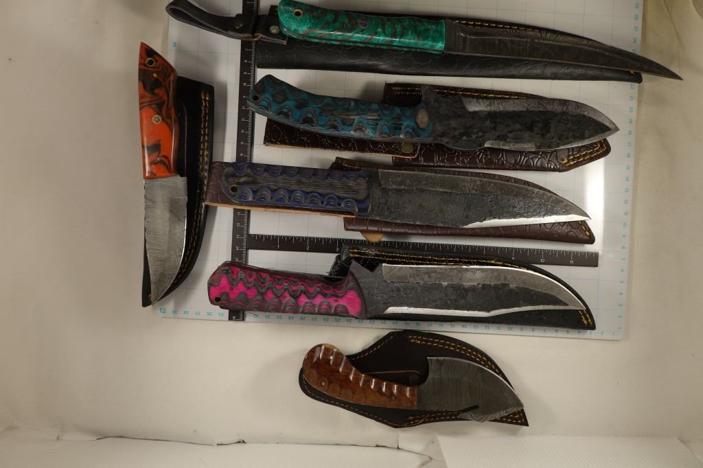 WITH LEATHER SHEETHS: 1-8 1/4", 1-8 1/4" WIDE BLADE, 1-12", 2-12 1/4" AND 1-13 1/4", SOME RUST PRESENT ON THE CARBON STEEL KNIVES. GREAT GIFTS FOR THE HOLIDAYS