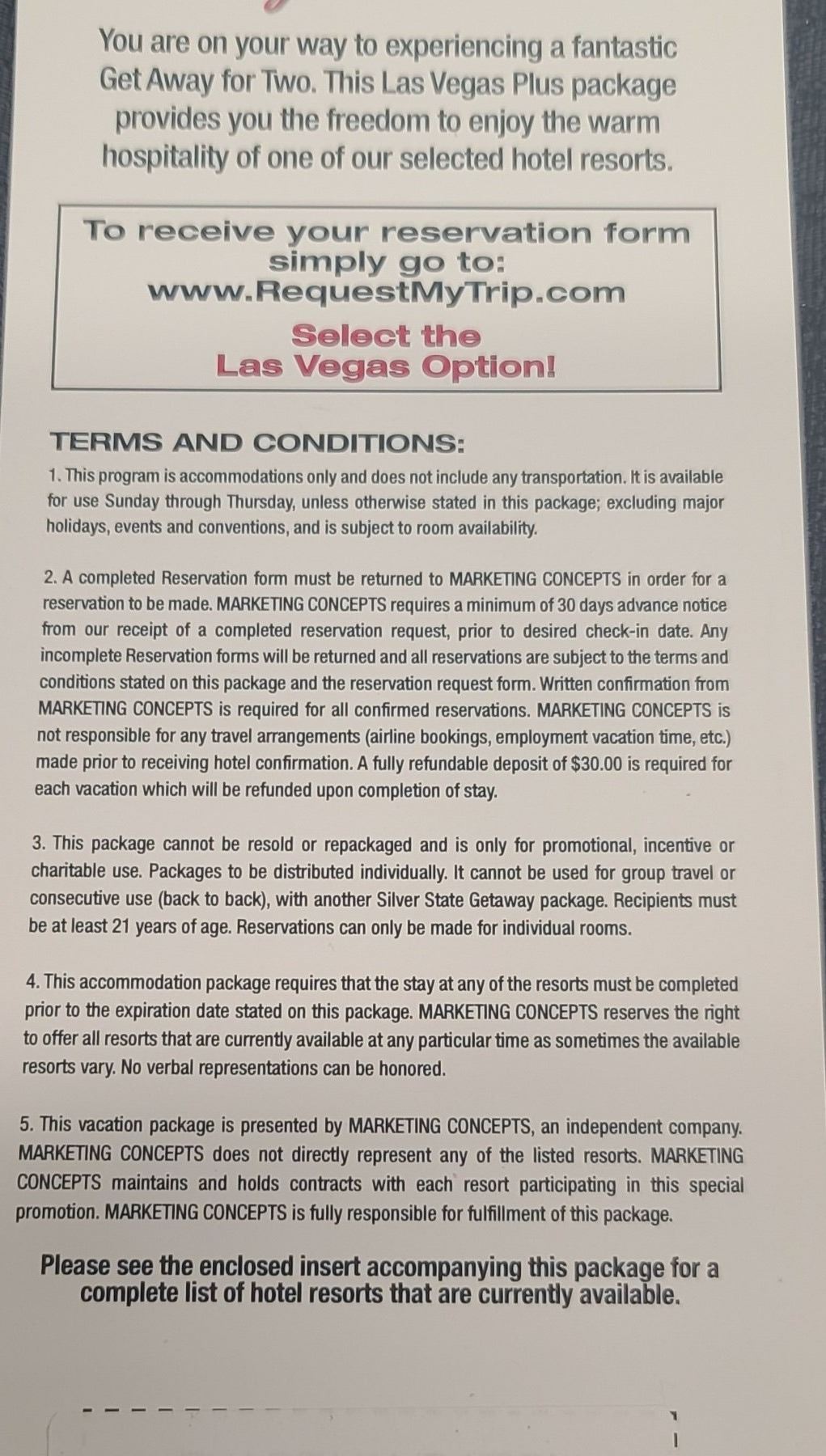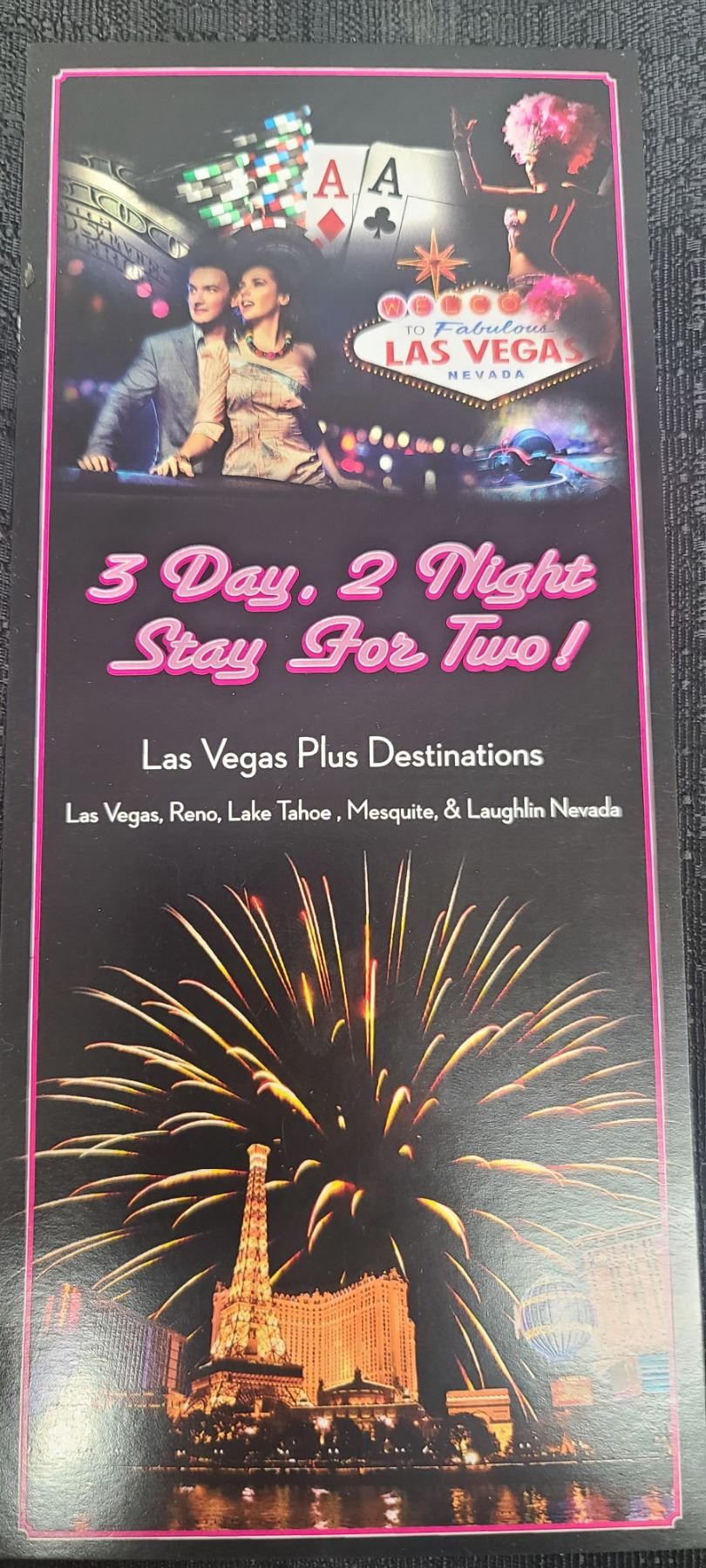 3 DAY, 2 NIGHT STAY IN VEGAS FOR TWO. AT YOU CHOICE OF RESORTS: LAS VEGAS, RENO LAKE TAHOE, MESQUITE, & LAUGHLIN NEVADA. FLIGHTS NOT INCLUDED