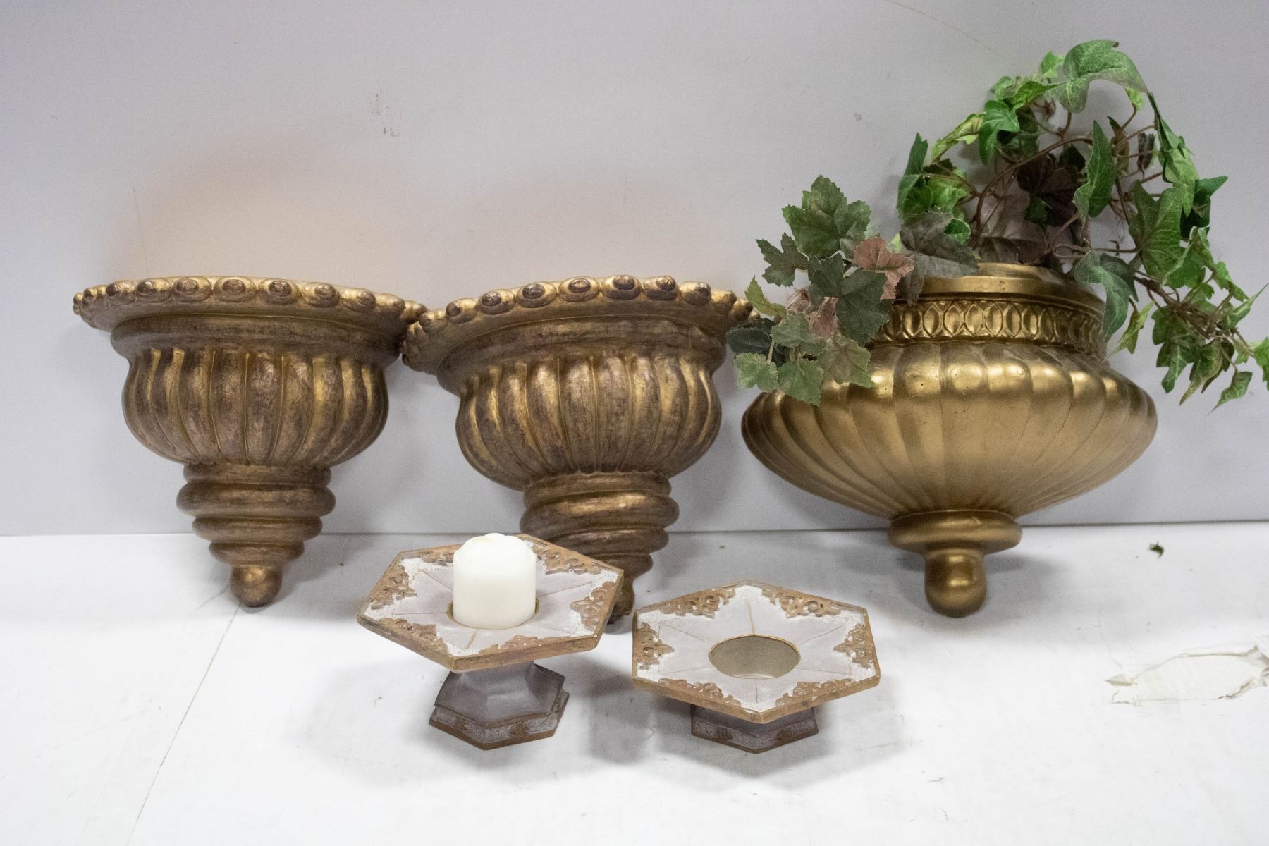 3 DECORATIVE WALL SCONCES, 2 CANDLE HOLDERS
