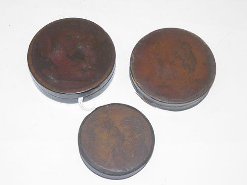 (3) DIFFERENT 19TH CENT. ROUND PAPIER MACHE SNUFF BOXES DEPICTING BEGGARS & COUPLES: (2) 3 1/2" & (1) 2 3/4" - LOSSES & IMPERFECTIONS;