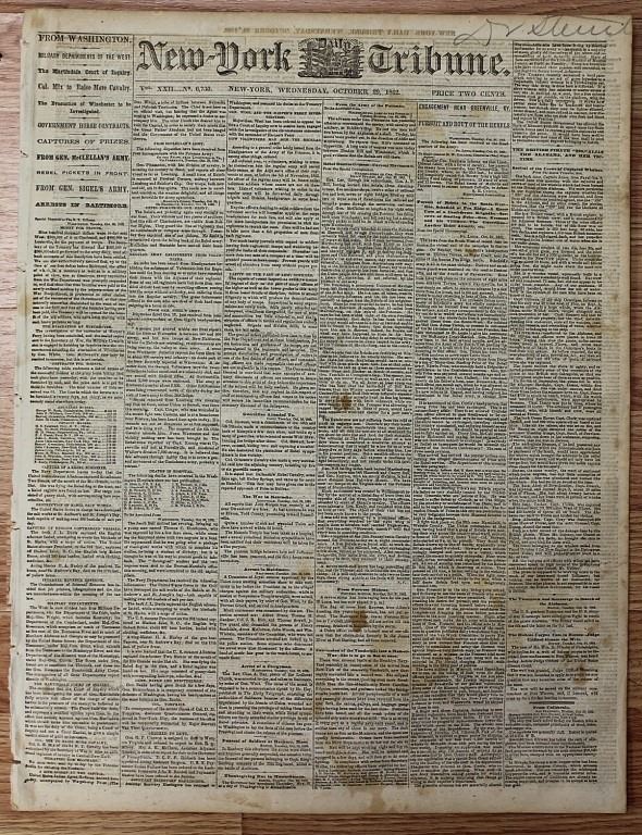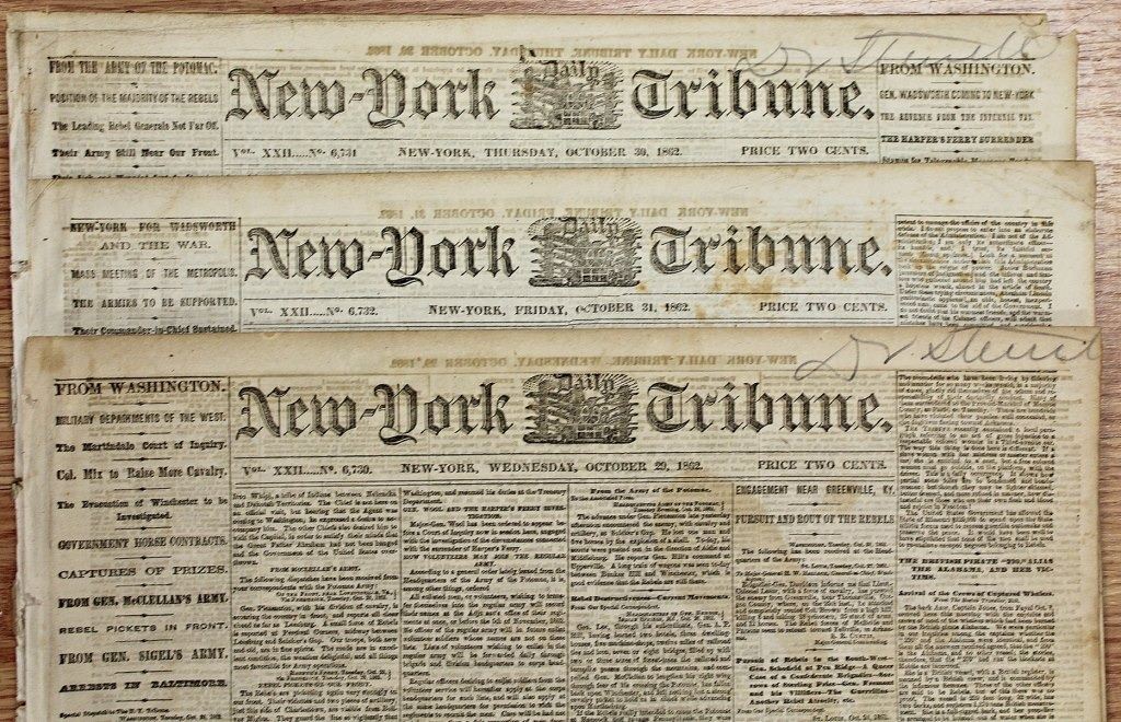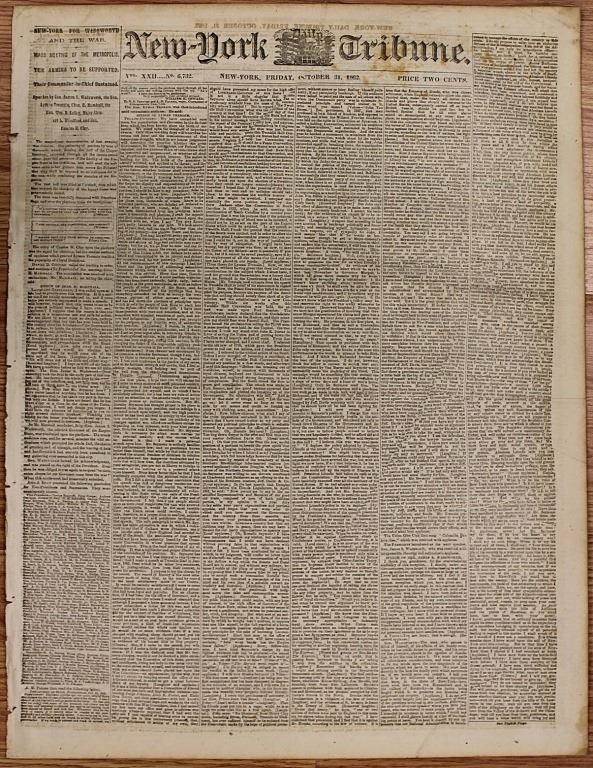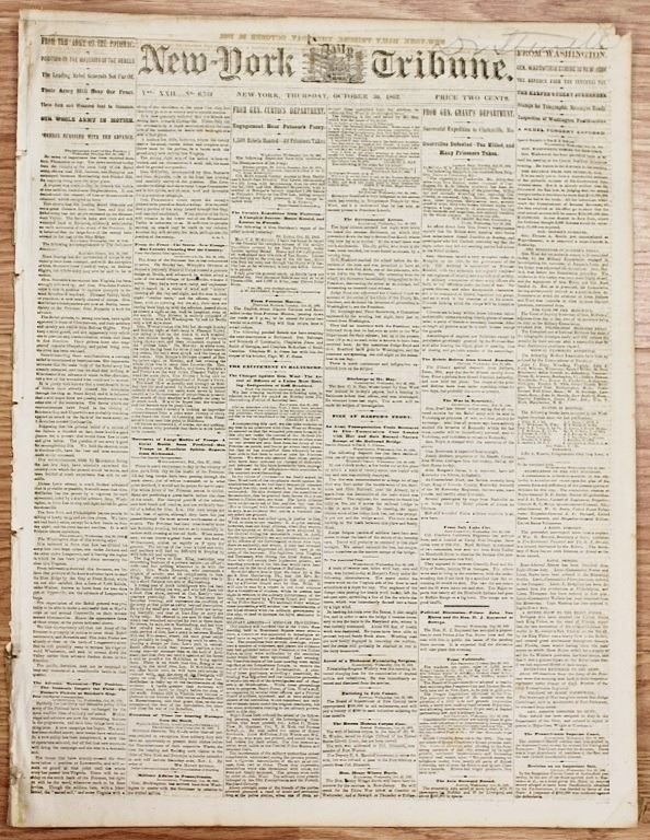 1861-1865. NEW YORK TRIBUNE, 100% AUTHENTIC AND ORIGINAL. WHAT A SUPER CONTENT TO READ! ESTIMATE: $150-$200