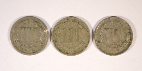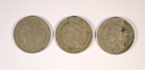 3 DIFFERENT THREE CENT NICKELS (65,67,81) GOOD-FINE