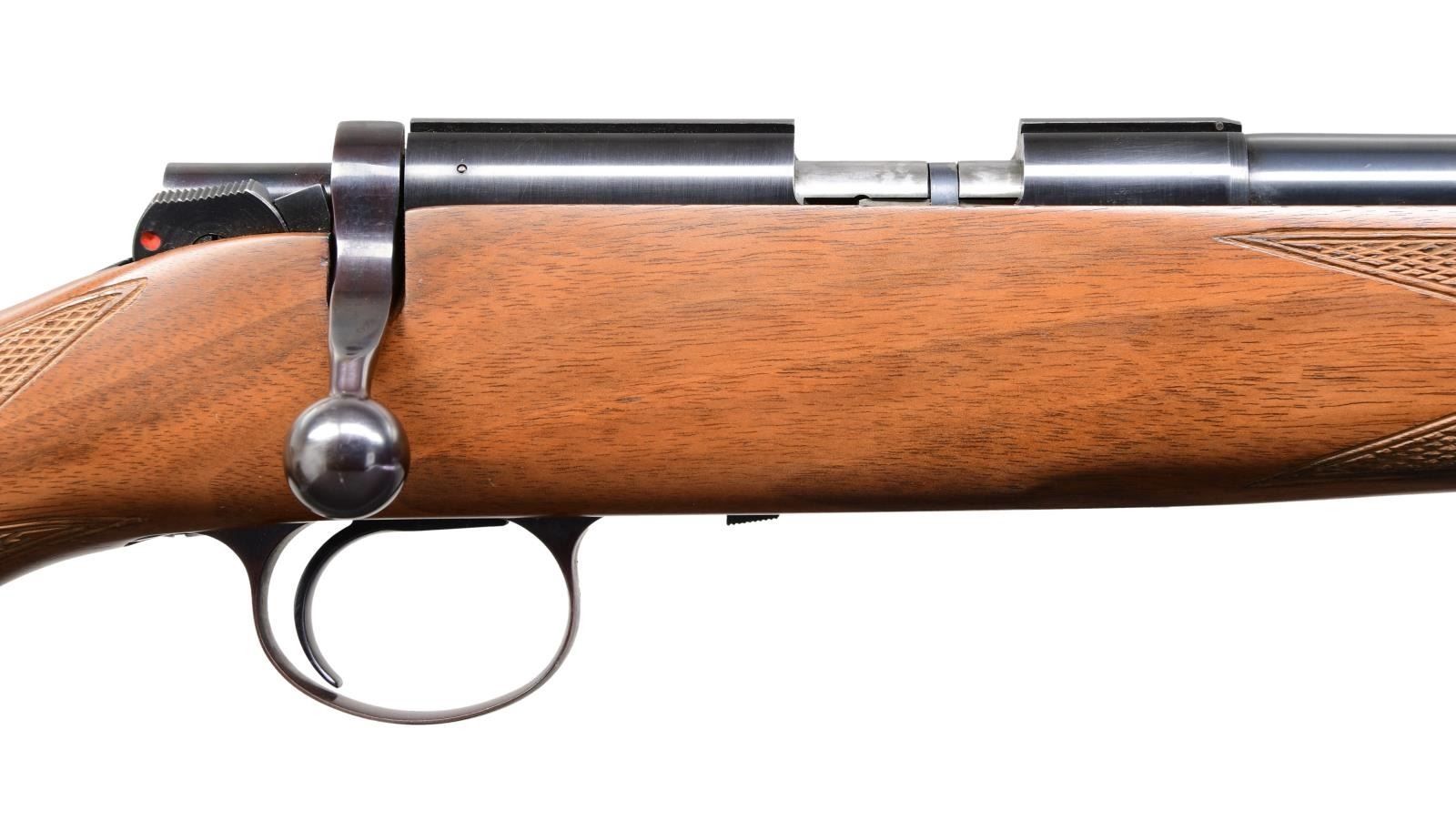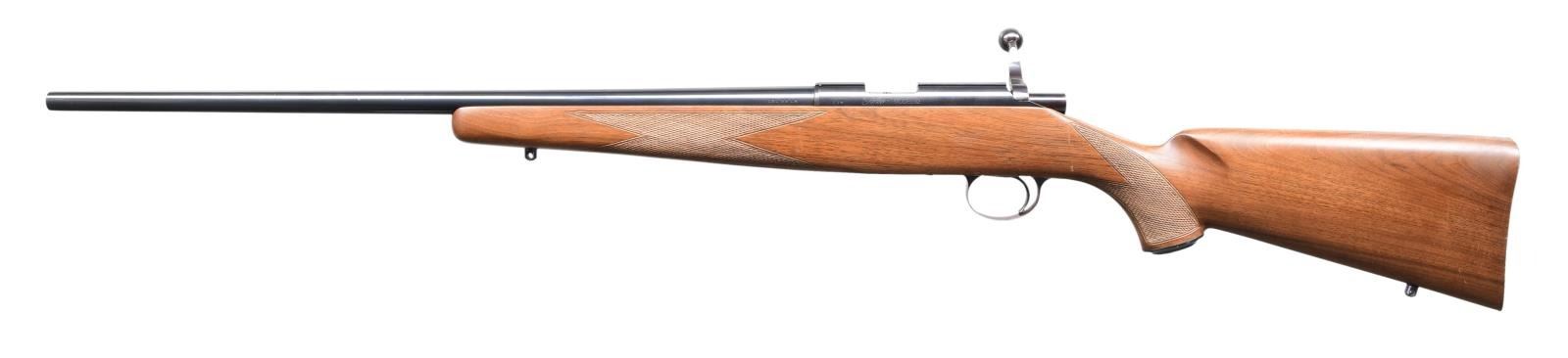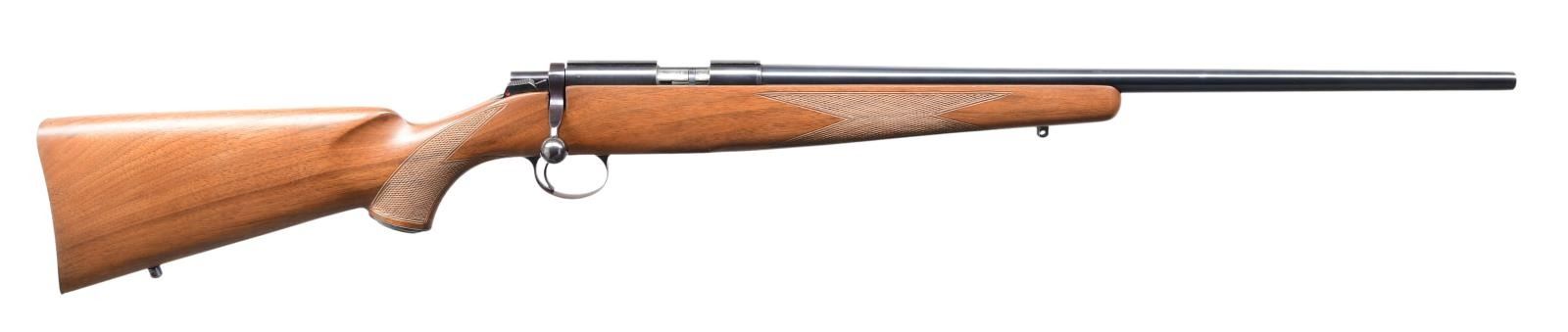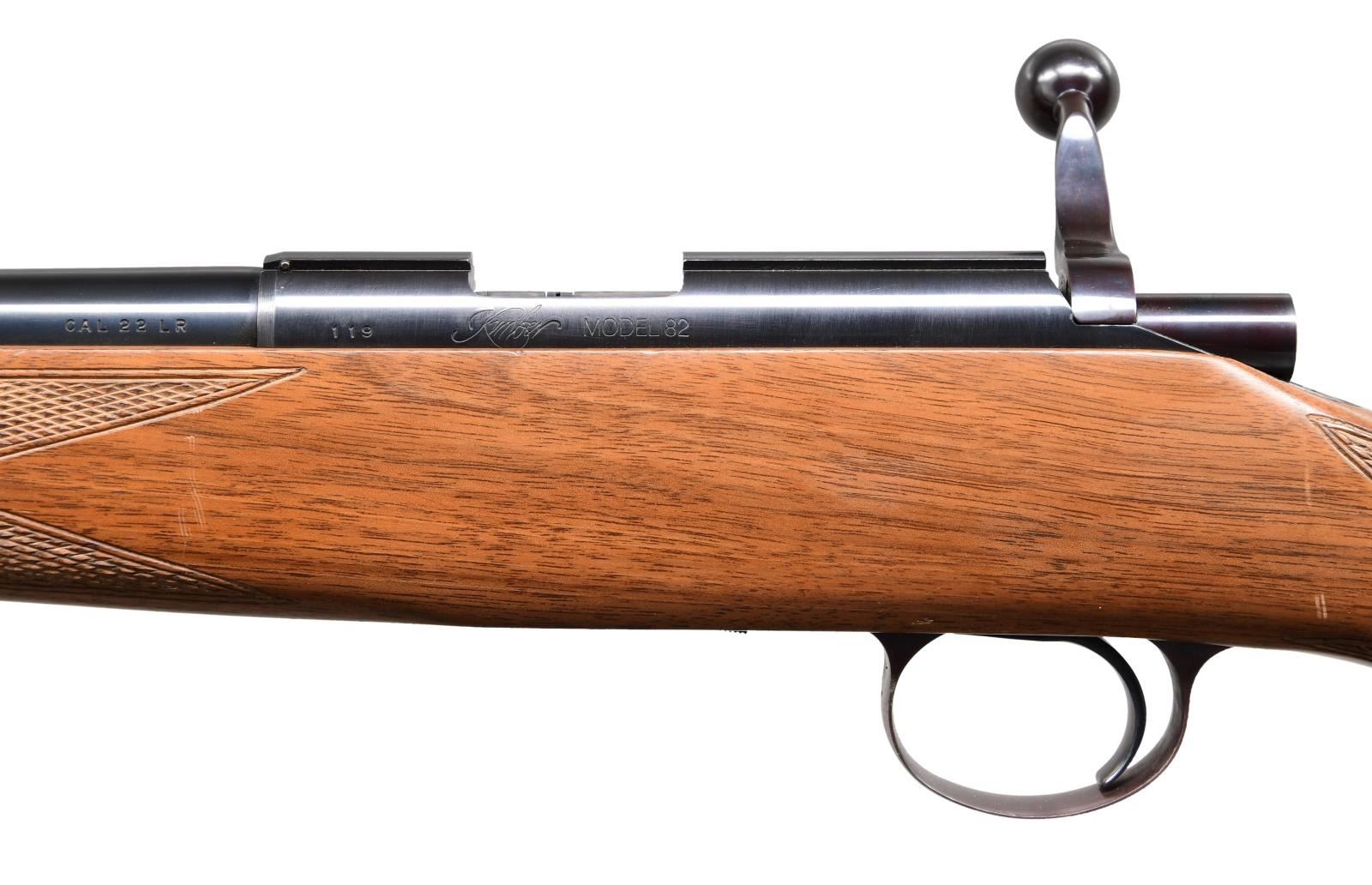 RIFLE. Cal. 22 LR. S# 119. Bbl. 22 1/4". Model 82 bolt action rifle mfg. by Kimber. The top of the bbl. is marked "KIMBER OF OREGON, INC., CLACKAMAS, OREGON, U.S.A.", with the cal. designation marked on the left at the breech. The left side of the receiver is marked with the S# "119", followed by the Kimber trademark logo and "MODEL 82". Metal components exhibit a blue finish, with trigger guard exhibiting a plum colored finish, and the bolt body being polished in-the-white. Checkered wood pistol grip buttstock with blued steel grip cap and checkered buttplate. MAGS: 1 5-rd. CONDITION: excellent, with metal components retaining bountiful amounts of their original factory blue finish overall, exhibiting a few scattered superficial handling marks. Mirror bore, exhibiting well defined rifling throughout. Stock exhibits a few marks and minor impressions from handling and storage, but is otherwise very good overall. (24-1848/MLW). MODERN. $1,000-1,500.