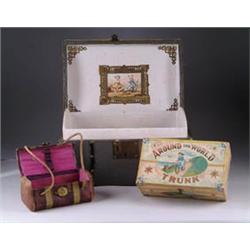 3 DOLL TRUNKS. 1) Bliss “Around the World”, 2) French Fashion style. 3) Trunk w/ tray. CONDITION: Overall very good. JL 1-2756-1099