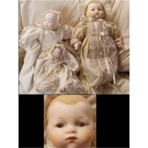 </font></strong>I have many more photos if you want to email me for them. This is for THREE bisque German dolls, one is marked Grace S Putnam. The largest is 15" long and has glass eyes and a long christening gown. The other two ( the largest of these two has the marking)have their own ruffles bassinet. The two that match are in great shape and have been kept in a case. The largest one with glass eyes was in a case with no glass so she is dusty. I am not that well versed in dolls so I don't want to attempt to clean her. I know when she went in that case she was in great shape less a small mark on her left cheek. So the only thing she has new is the dust :)). YOu are getting all three. </font>