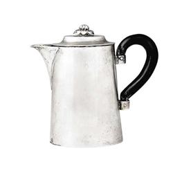 Silver, 134 g. Round stepped base, egg shape body, hinged cover and elegant handle. On the rim of the base there are lace-shaped leaves, on the body t