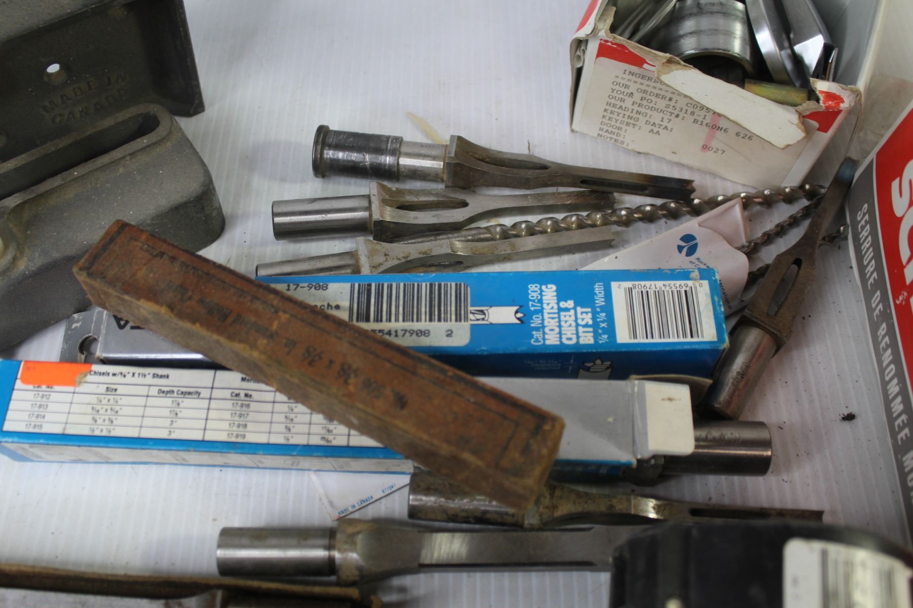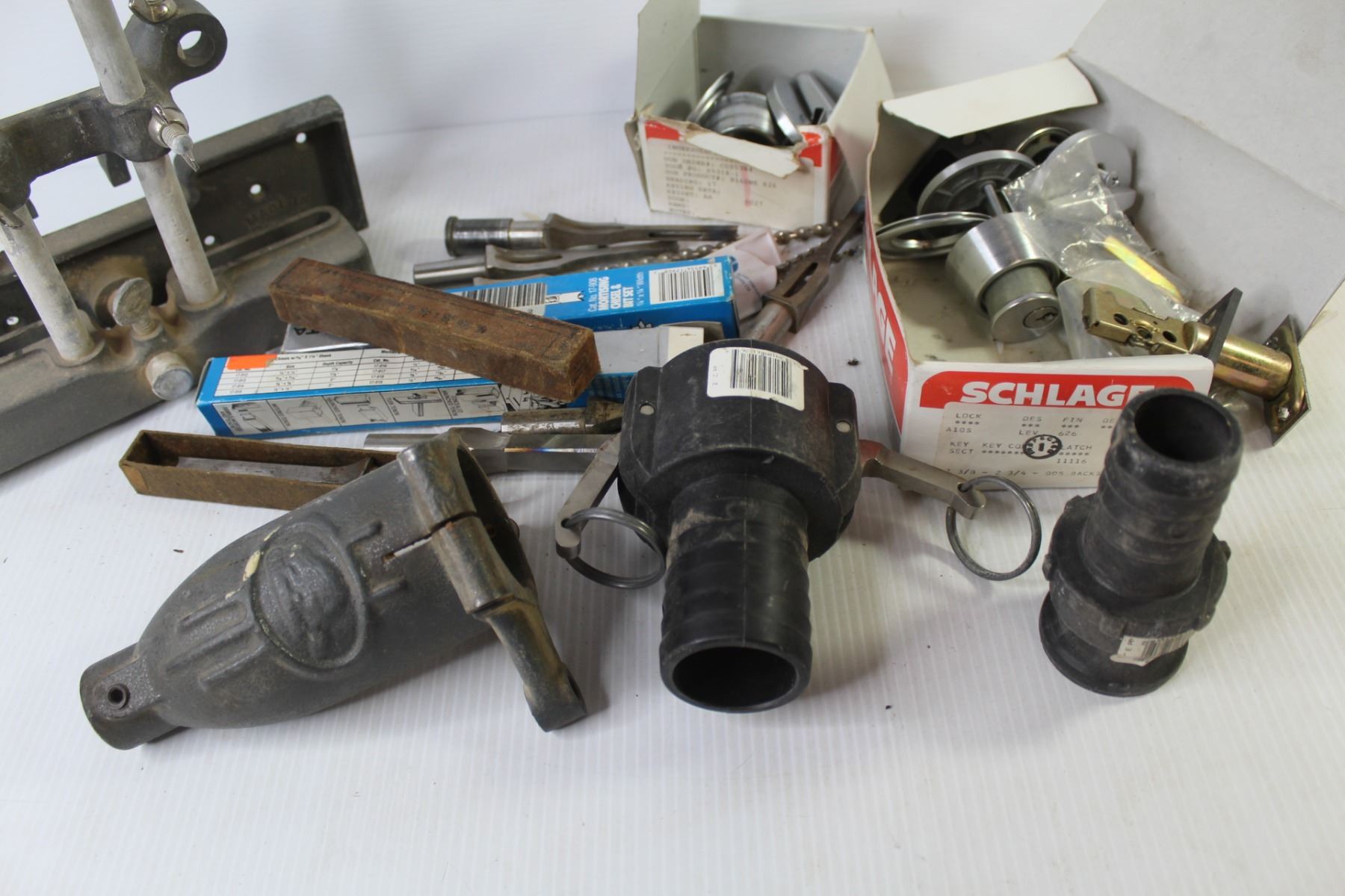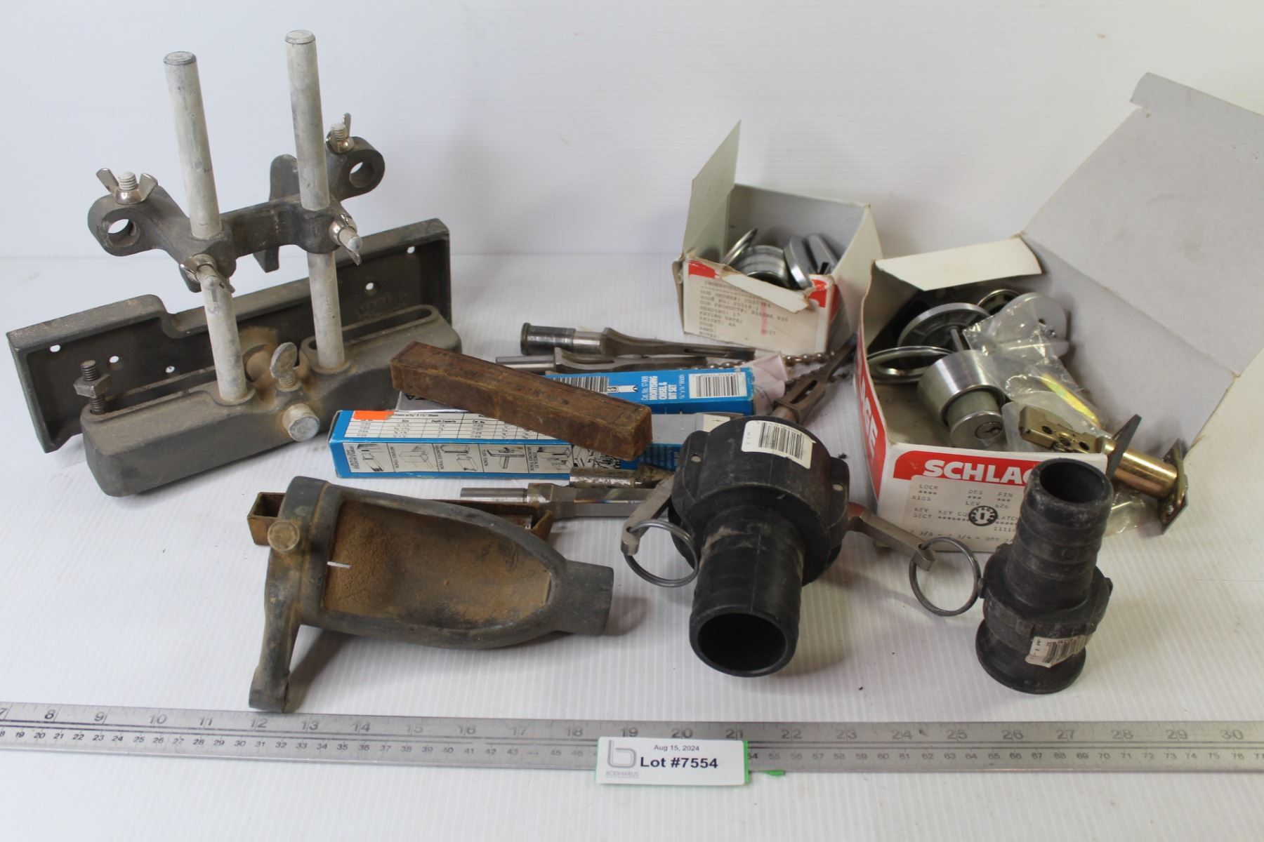 (3) Dead Block Lock (unknown completion) - Mortising Drill Bits - Hose Ends (1 1/2"- 2" Coupling Ends - Hollow Chisels