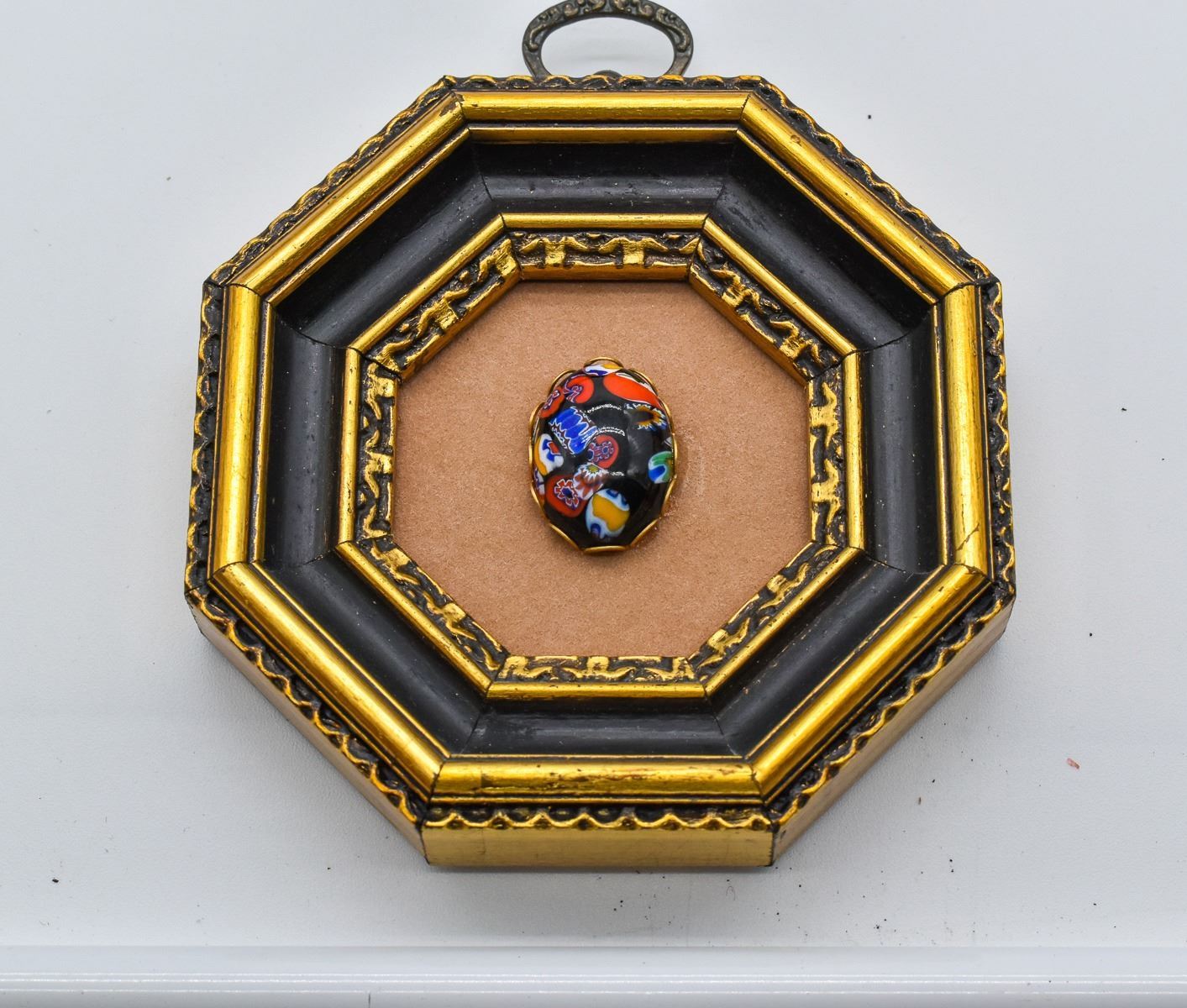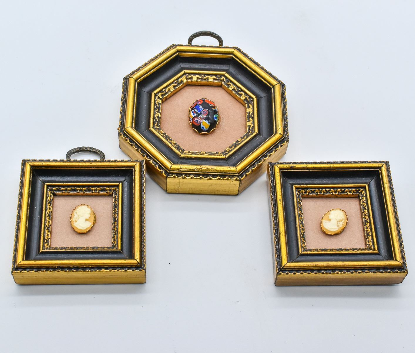 3 Decorative Framed Cameos, largest measures 4'' x 4'', includes 2 cameos and 1 Murano glass cabochon (largest measuring 1 1/8''L x .75'')
