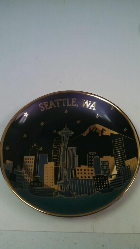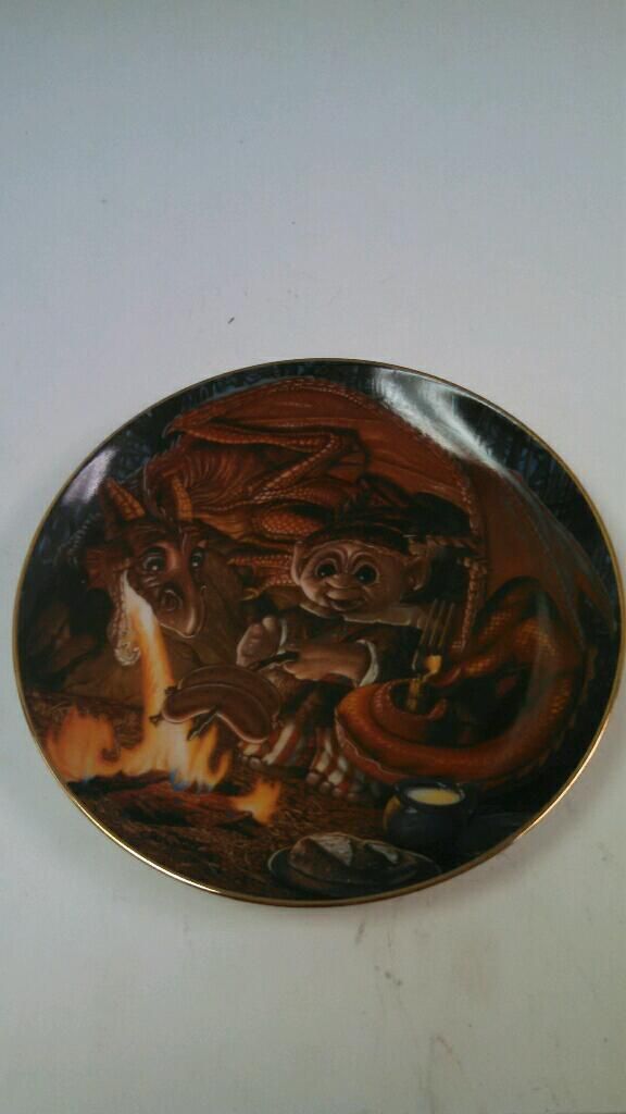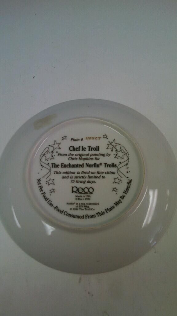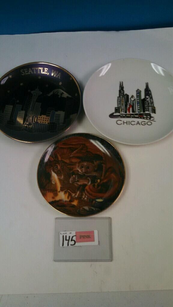 (3) Decorative Plates for one money Chef le Troll from The Enchanted Norfin Trolls by Chris Hopkins #1104 ct Limited Edition and (2) city Plates from Chicago and Seattle