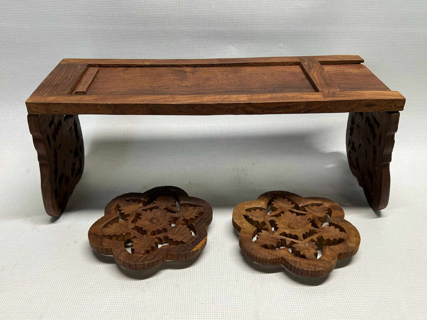 Large one is 16x6" and is expandable. The smaller ones are about 6". 3 Decorative Wooden Plant Stands / Holders (one expands)