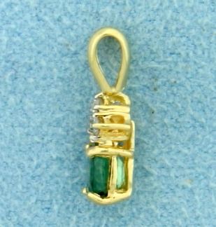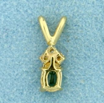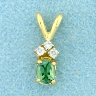 In 14K Yellow Gold. Contains a natural 5x3mm oval shaped Peridot gemstone with bright green color and excellent clarity. Also contains three high quality .02ct Diamonds, SI clarity/G color. 1/2" long with bale. 0.6g