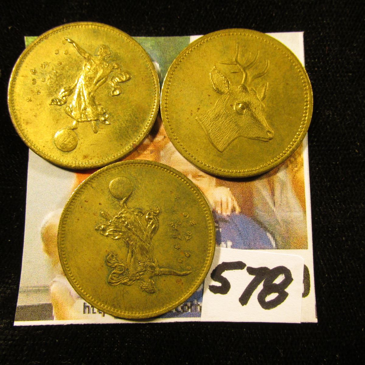 (3) Different German Spiel Markes. Mystical Piece with smiling male obverse and gowned lady standing on globe and sprinkling magical figures into the air; another with Stag Head, & last having a prancing horse.