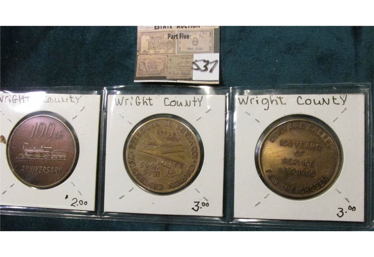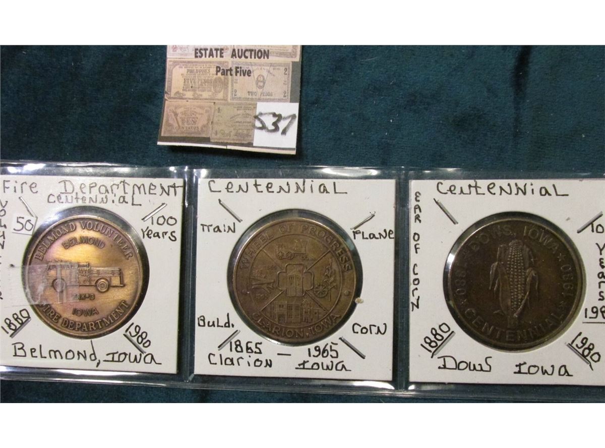 (3) Different Iowa Centennial Tokens. Belmond Fire Days, Clarion, & Dows, iowa.
