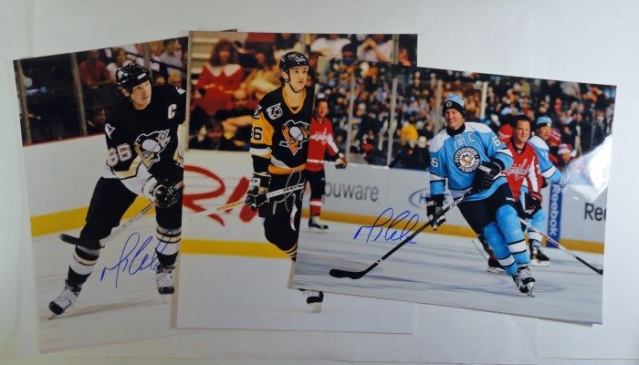 3 different 16 x 20 photos signed by Mario Lemieux 2 with blue sharpie & 1 with black sharpie. No COA's. Est. Value $125.00 - $175.00.