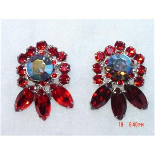 Look at these rich deep red rhinestone clipped earrings. There are 4 different shapes and configurations of stones. These stick up in a 3 dimensional design. all stones appear original, intact and sparkling. They measure 1 1/2 inches tall