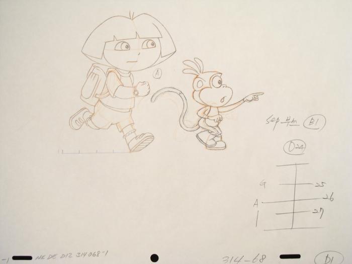 These show Dora and Boots having fun, and running along with a rather determined look.Medium: Black and orange pencil on white paper, with animator notations in black pencil; the bottom of each sheet has peg holesSize: 10 1/2 x 12 1/2 inchesCertificate of Authenticity includedCondition: Excellent Dora takes Boots exploring with her, and these great original drawings show some of their adventures.