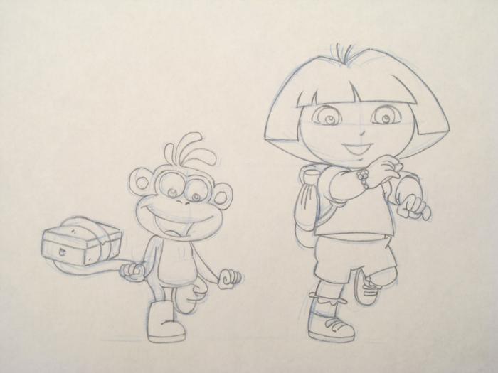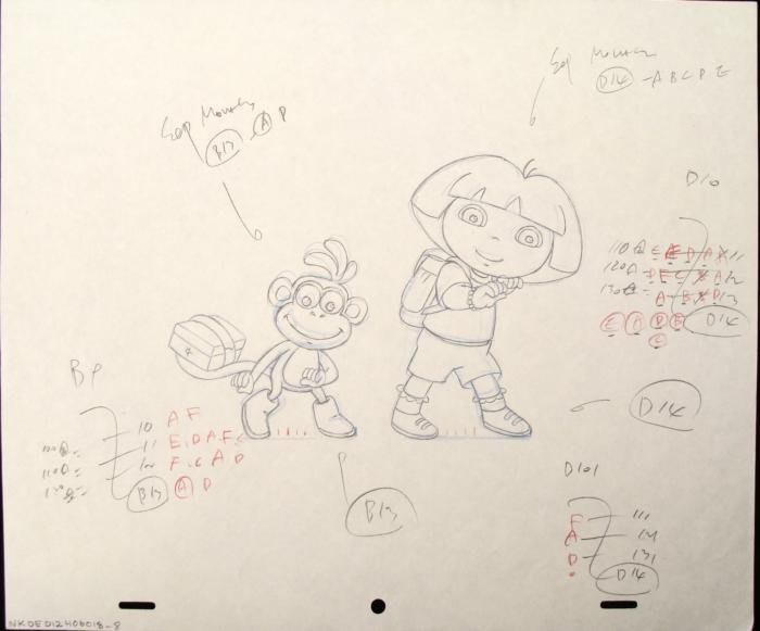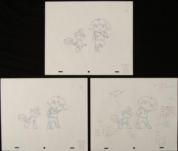 Dora is shown here with her backback, while her friend Boots carries his items with his tail. Medium: Black and non-photo blue sketch pencil on white paper, with animator notations in black and red pencil, and erasure marks; the bottom of each sheet has peg holesSize: 10 1/2 x 12 1/2 inchesCertificate of Authenticity includedCondition: ExcellentThese original drawings nicely show the process of animation, as well as a charming scene of Dora and Boots!