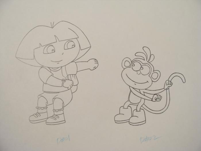 Dora is shown here dancing with her friend Boots. That monkey sure has some good moves!Medium: Black pencil on white paper, with animator notations in black and blue pencil; peg holes on the bottomSize: 10 1/2 x 12 1/2 inchesCertificate of Authenticity includedCondition: ExcellentDora and Boots are the best of friends, and their friendship comes to life with these great original drawings!