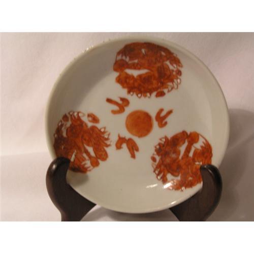 These 3 dishes are painted in iron-red and depict "the dragon chasing the pearl". They were used for banquet settings to serve pickled root vegetables. Two have the red wax seal from the minister of antiquities. Where the seal was affixed, can be seen on the third one. Each has a similar marking on the back. One does not have a design around the pearl in the center. They were hand painted which is why they aren't exactly alike. There is some minor roughness on the rim of one and on the bottom rim of all three. I think it's probably something done when made. These are not fine pieces. Rather they are utilitarian in nature.