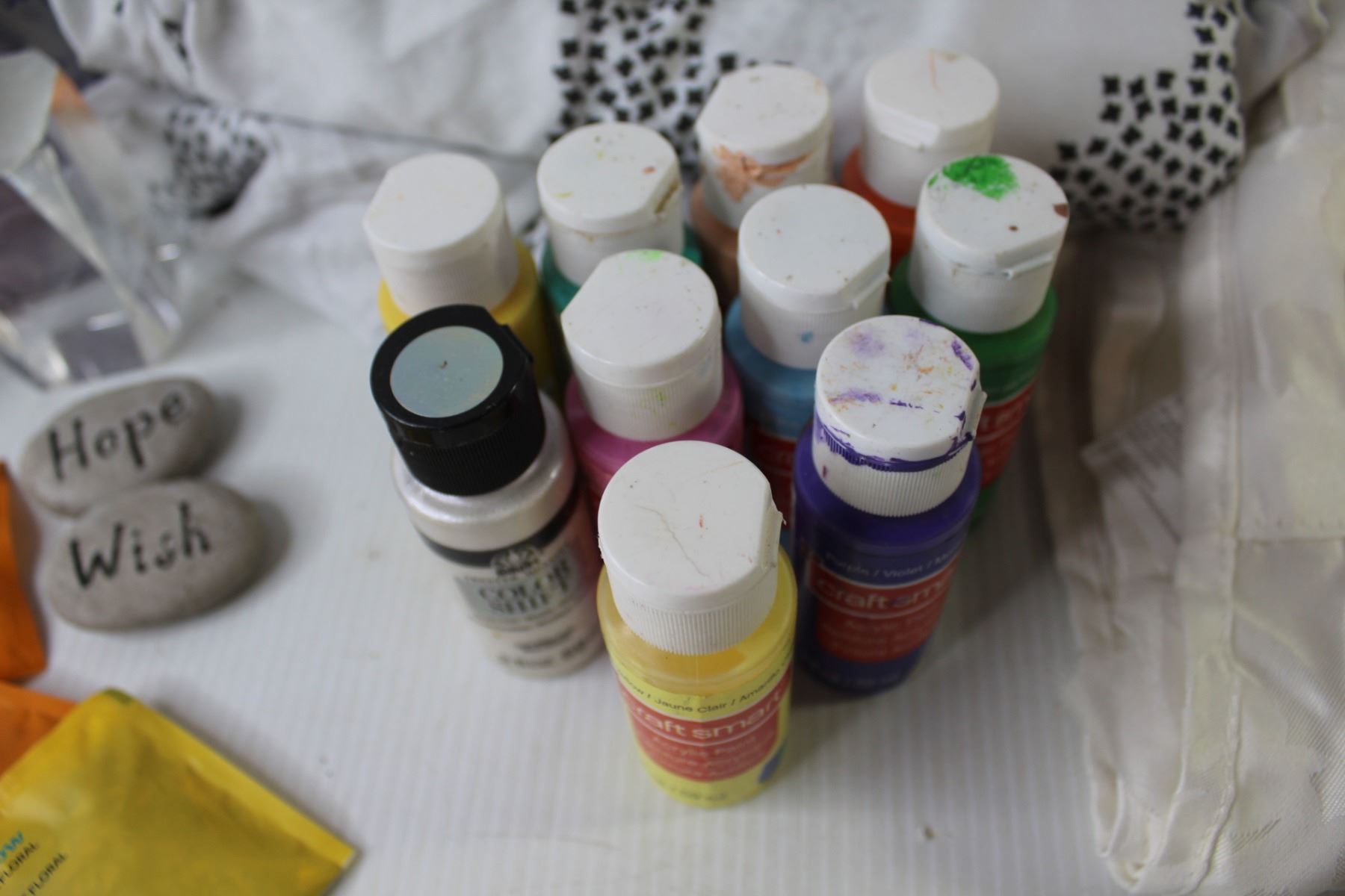 (3) Drapes - 82" Long x 4' Across - 2 Silver 1 White, Set of Bed Sheets, Assorted Acrylic Paints, Wicker Basket, $10 Coin Bank, Pencil Case with Contents, Kodak 1GB Memory Card, Misc.