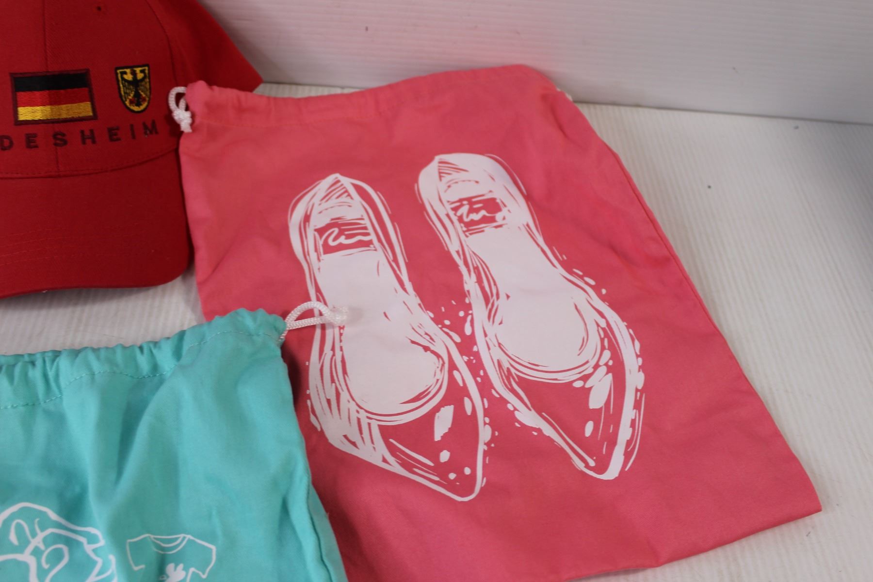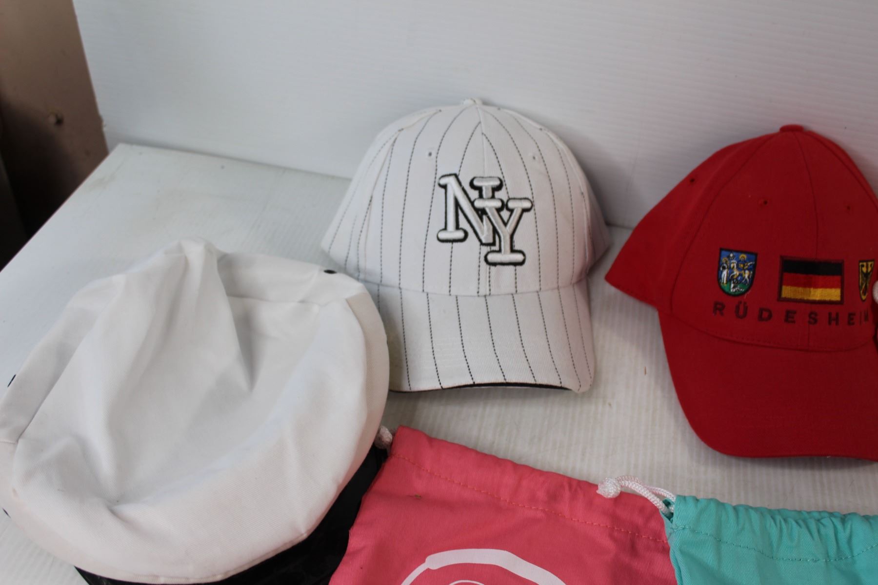 (3) Drawstring Bags, (2) Baseball Caps Hats, Sailers Hat